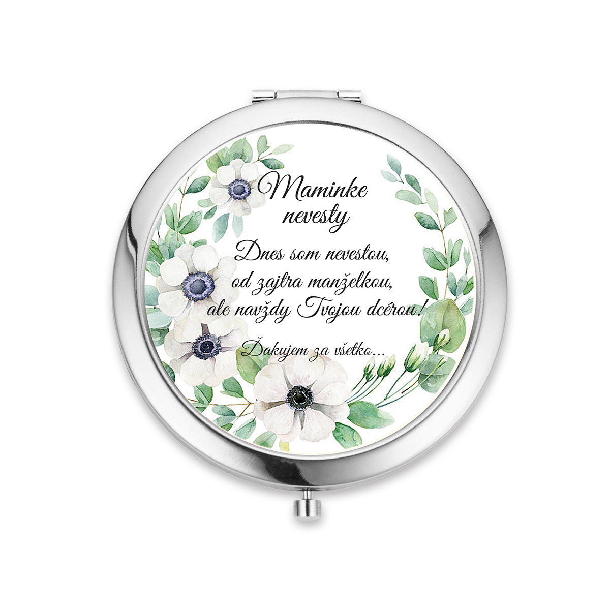 Kvalitné zrkadielko do kabelky s jednoduchým otváraním pomocou stlačenia. Zrkadielko je milým aj praktickým darčekom na rôzne príležitosti - napr. pre družičky, nevestu, svedkyňu, svadobné mamy, kamarátky, maminku, sestru a pod. Vo vnútri sú dve zrkadielka. Zrkadielko je z bižutérneho kovu bez obsahu niklu, olova a kadmia a grafický obrázok je pod vrstvou živice. Obrázok má priemer 57mm.