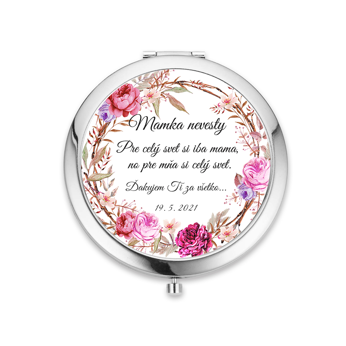 Kvalitné zrkadielko do kabelky s jednoduchým otváraním pomocou stlačenia. Zrkadielko je milým aj praktickým darčekom na rôzne príležitosti - napr. pre družičky, svedkyňu, svadobné mamy, kamarátky, maminku, sestru a pod. Vo vnútri sú dve zrkadielka. Zrkadielko je z bižutérneho kovu bez obsahu niklu, olova a kadmia a grafický obrázok je pod vrstvou živice. Obrázok má priemer 57mm.