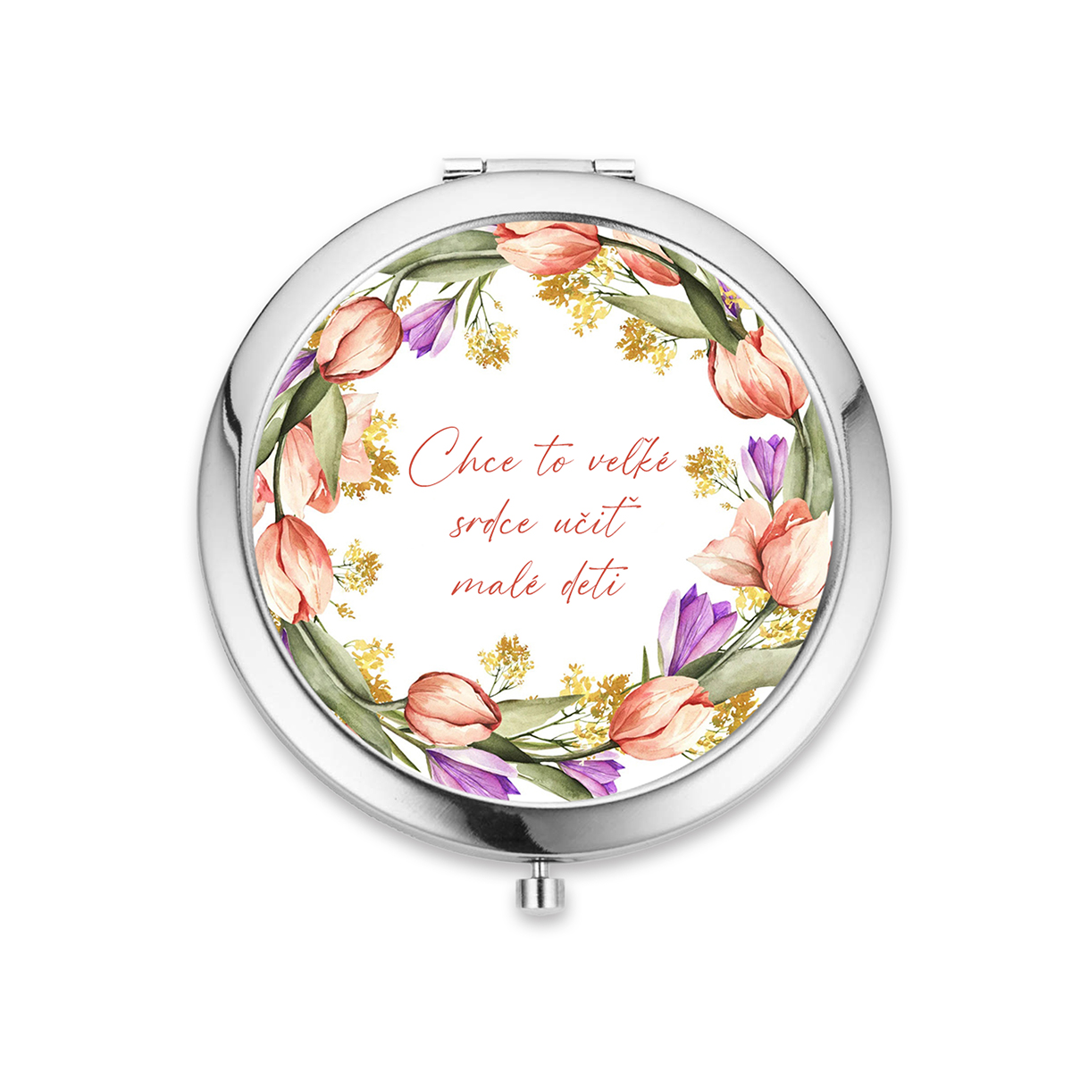 Kvalitné zrkadielko do kabelky s jednoduchým otváraním pomocou stlačenia. Zrkadielko je milým aj praktickým darčekom na koniec školského roka, na deň učiteľov alebo ako pamiatku pre pani učiteľku. Vo vnútri sú dve zrkadielka. Zrkadielko je z bižutérneho kovu bez obsahu niklu, olova a kadmia a grafický obrázok je pod vrstvou živice. Obrázok má priemer 57mm.