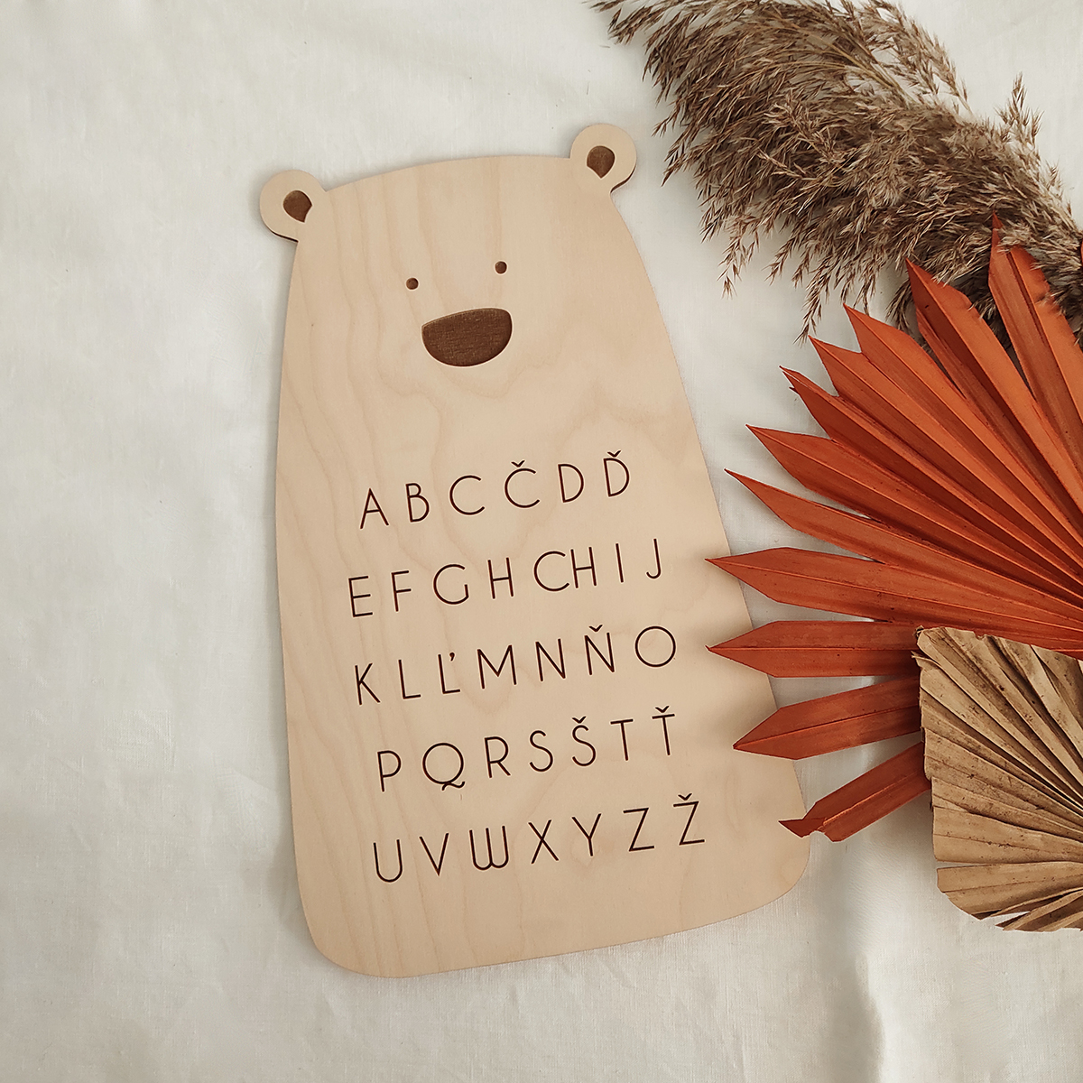 Originálna dekorácia do detskej izby v tvare macka s abecedou. Detičkám pomôže pri učení sa jednotlivých písmen a abecedy. Dekorácia je vyrobená z drevenej preglejky hrúbky 4mm. Na zadnej strane je kovový háčik na zavesenie na stenu.