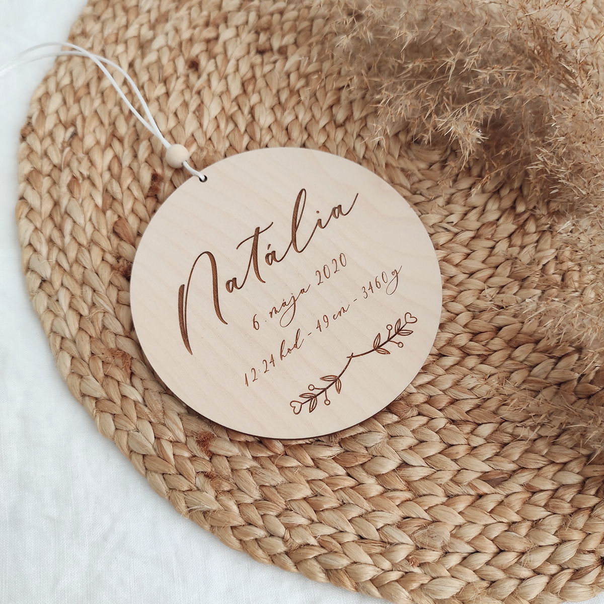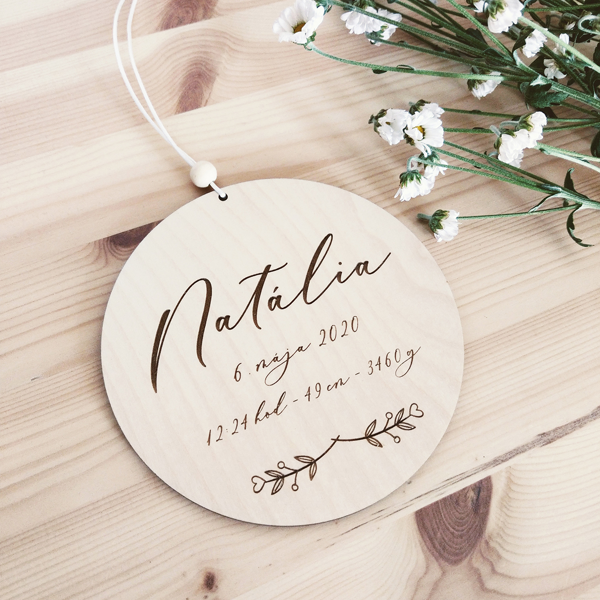 Tabuľka s menom a údajmi o narodení vhodná ako dekorácia do detskej izby. Tabuľka je vyrobená z kvalitnej preglejky hrúbky 4mm s hladkým povrchom a je doplnená šnúrkou s drevenou korálkou.