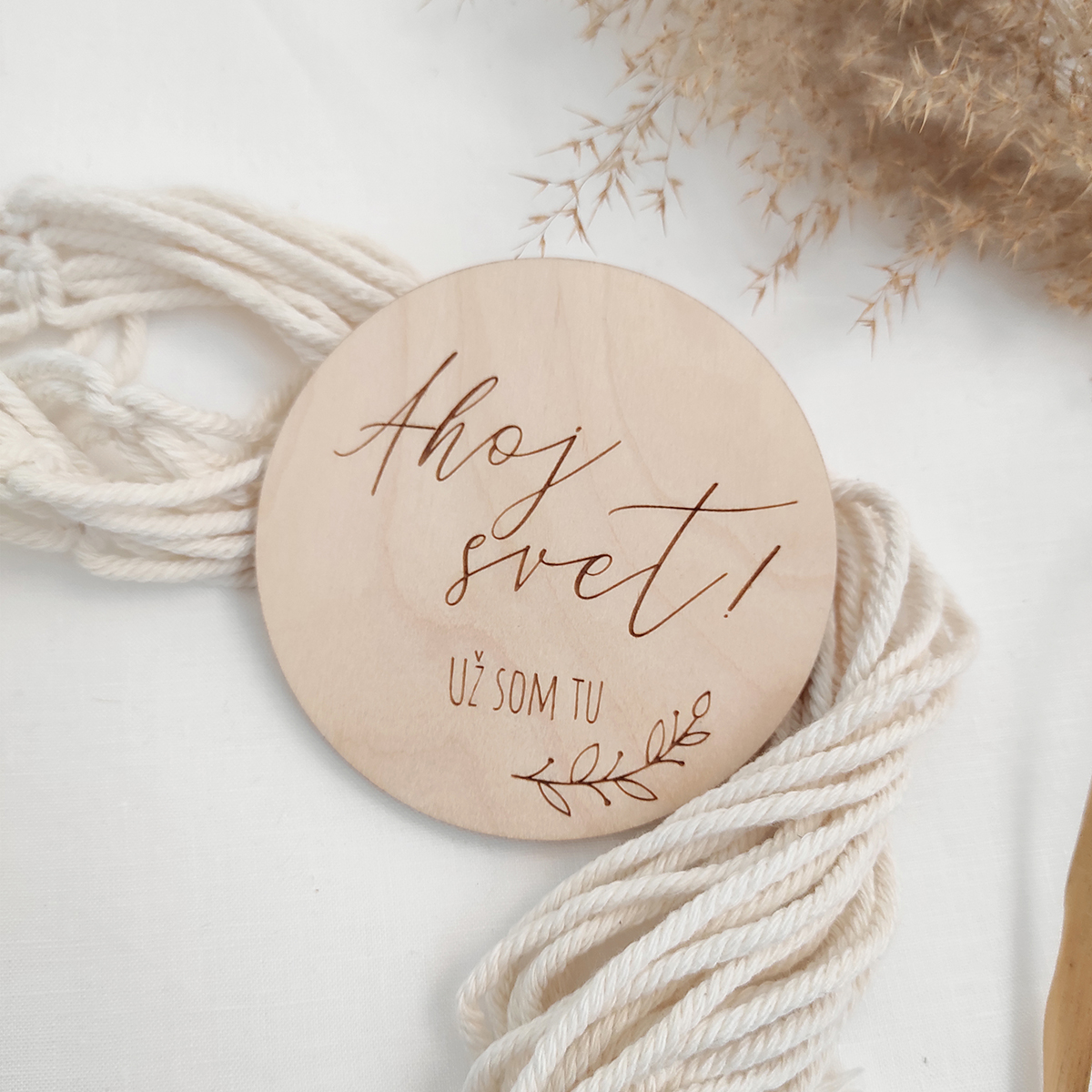 Originálna miľníčková tabuľka v tvare kruhu s vygravírovaným textom Ahoj svet! Už som tu a vetvičkou.