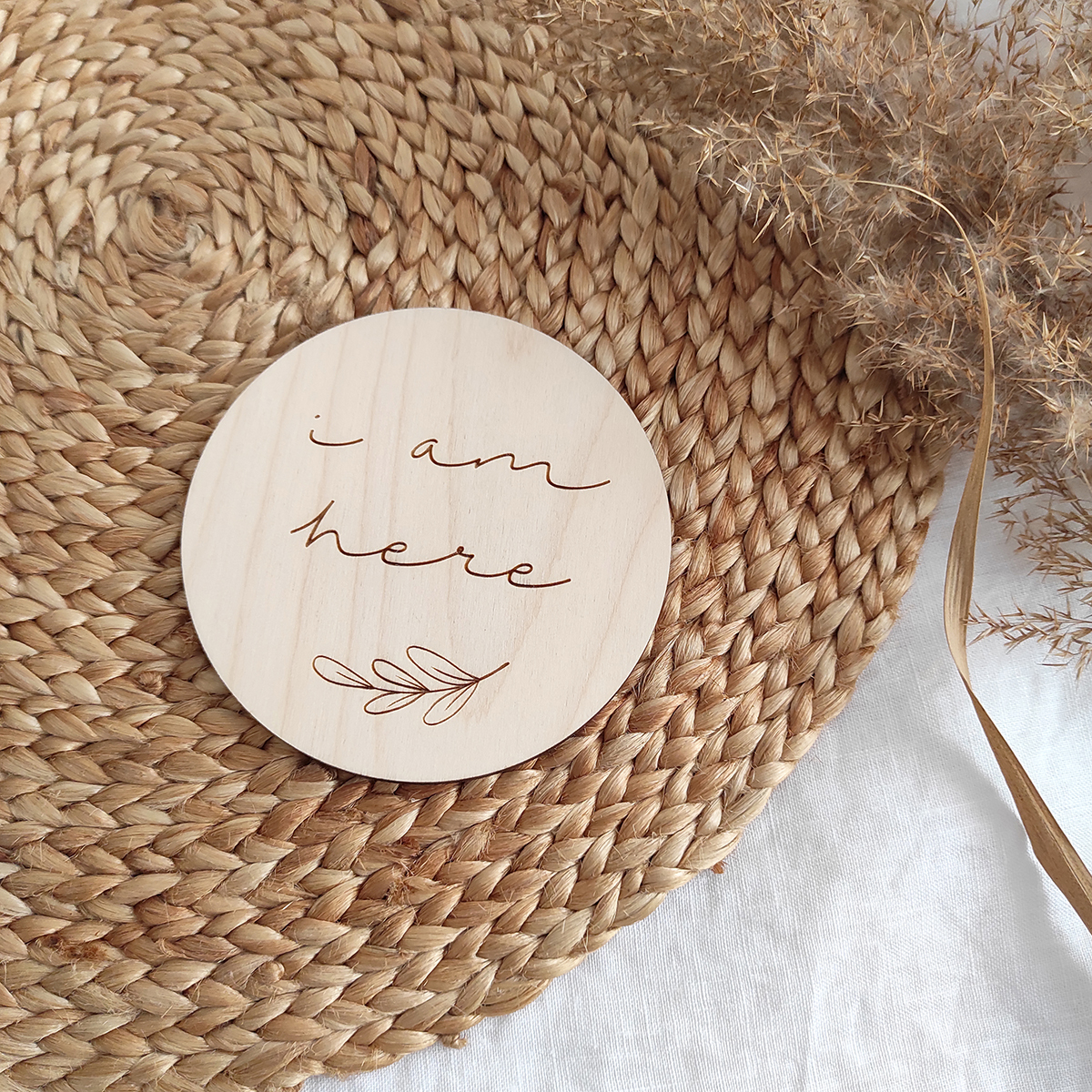 Originálna miľníčková tabuľka v tvare kruhu s vygravírovaným textom I am here doplneným vetvičkou.