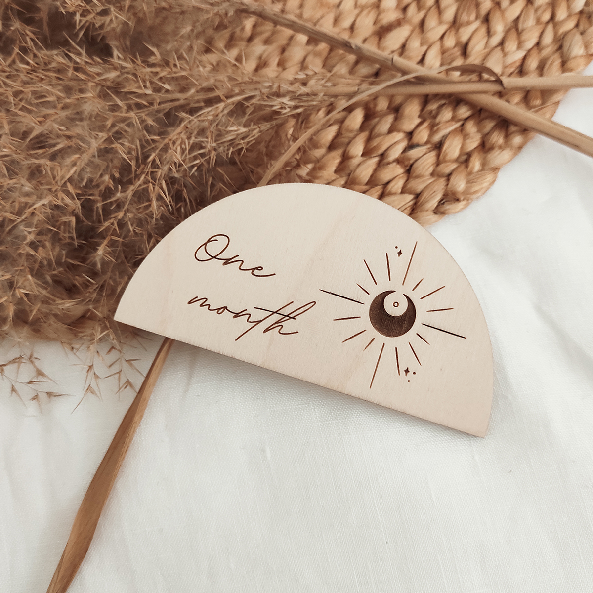 Miľníčky nemusia byť len v tvare kruhu. Vyrobili sme pre to túto originálnu miľníčkovú tabuľku v tvare polkruhu s vygravírovaným textom One month v boho štýle.