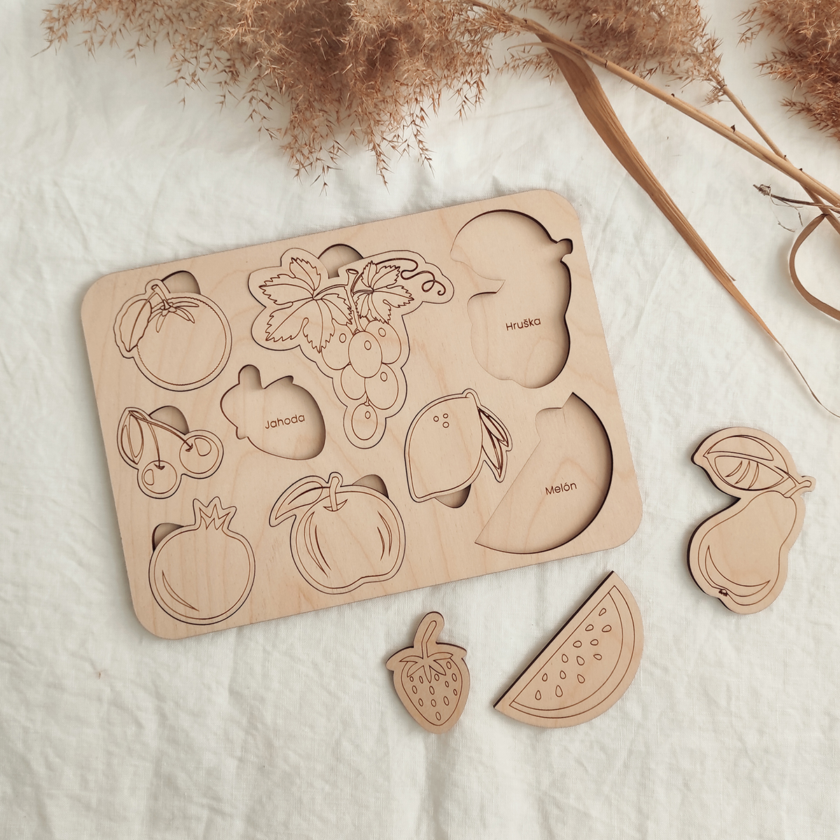Vkladačka zabaví detičky, pomôže rozvíjať jemnú motoriku, zručnosť, sústredenie a pamäť a zároveň pomáha spoznávať druhy ovocia.