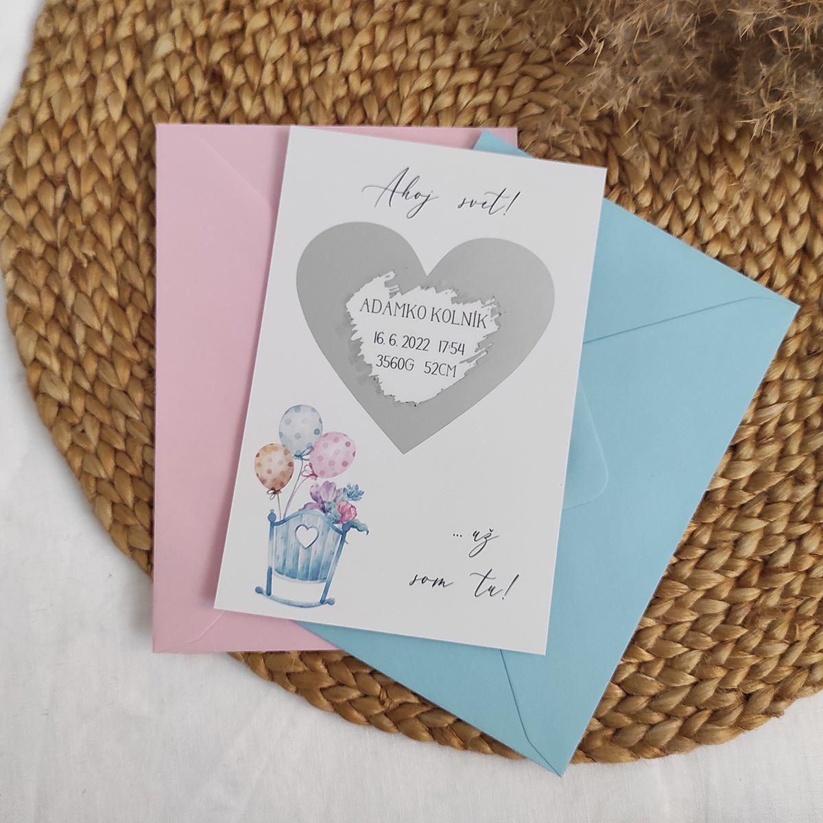 Oznámenie o narodení bábätka so stieracím srdiečkom, pod ktorým sa nachádza meno, dátum a čas narodenia a miery bábätka.