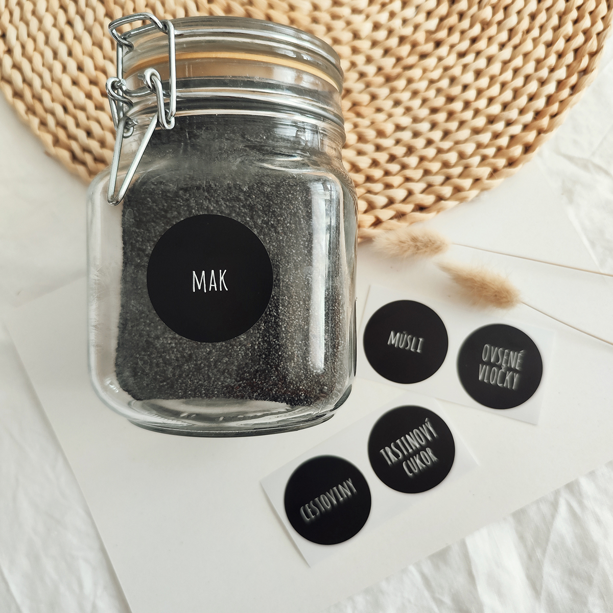 Minimalistické okrúhle nálepky odolné voči vode dokonale doplnia vašu kuchyňu. Vďaka nálepkám môžte označiť rovnaké dózy a dávkovače.