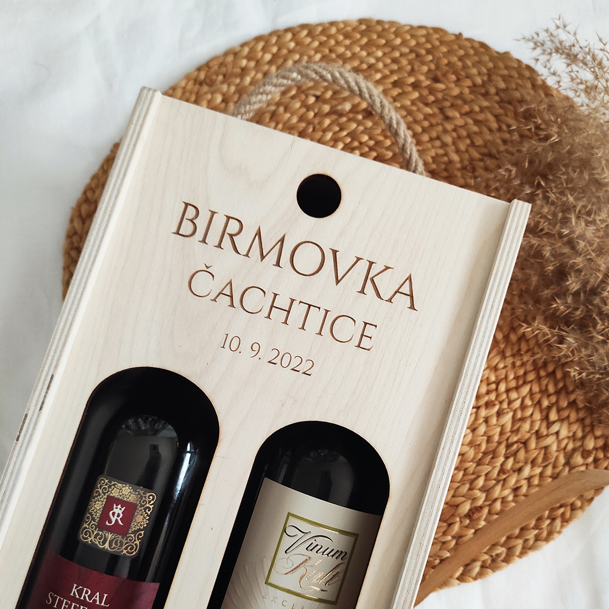 Drevená kazeta, box, krabica na 2ks vína s vlastným gravírovaním. Vygravírovať si môžte vlastný text, poďakovanie, vinš alebo napr. svadobné logo či logo firmy.