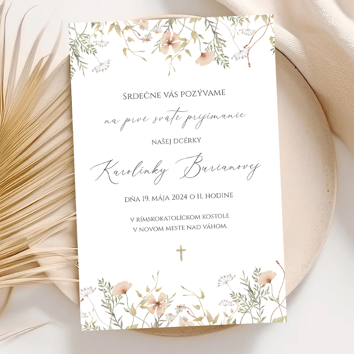 Jemná pozvánka k prvému svätému prijímaniu tlačená na hladký matný biely fotopapier, hrúbka 240 gramov.