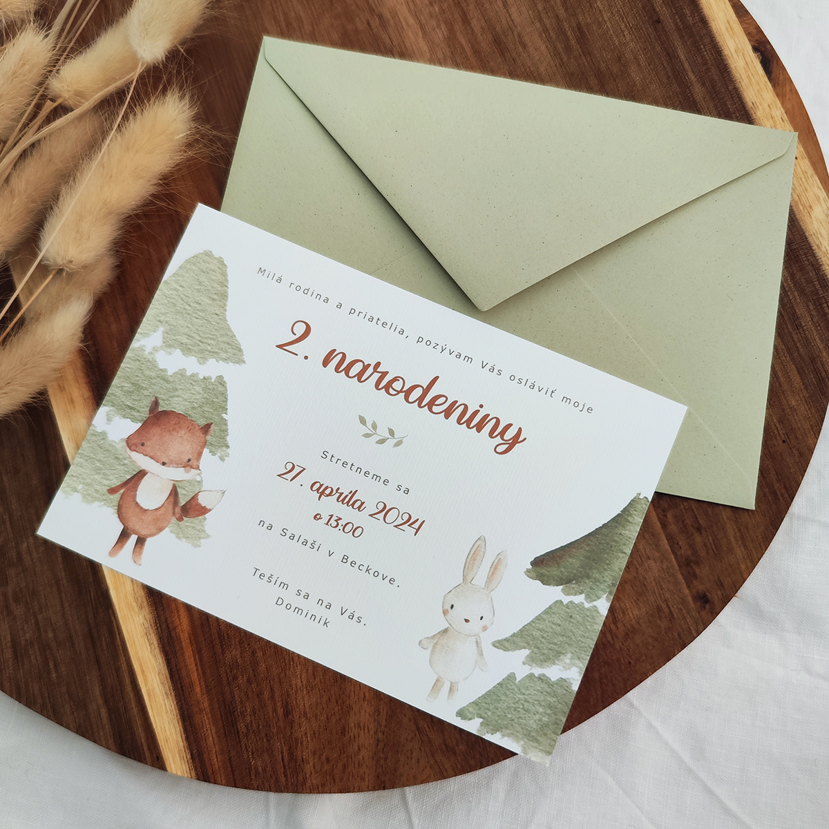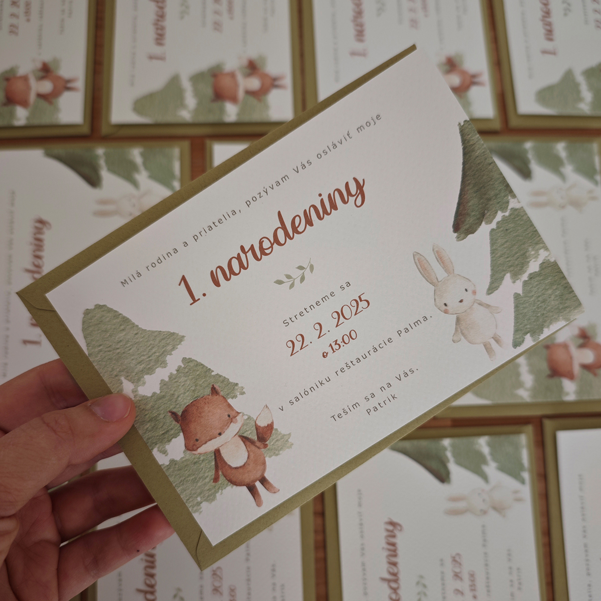 Detská pozvánka na narodeniny s obálkou s lesnými zvieratkami tlačená na hladký matný biely fotopapier, hrúbka 240 gramov.