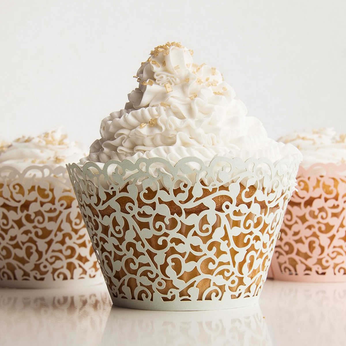 Ozdobné čipkované košíky na muffiny vyrezávané z perleťového tvrdého papiera. Košíky sú dodávané v rozloženom stave, stačí ich len stočiť a zaseknúť do výrezu.