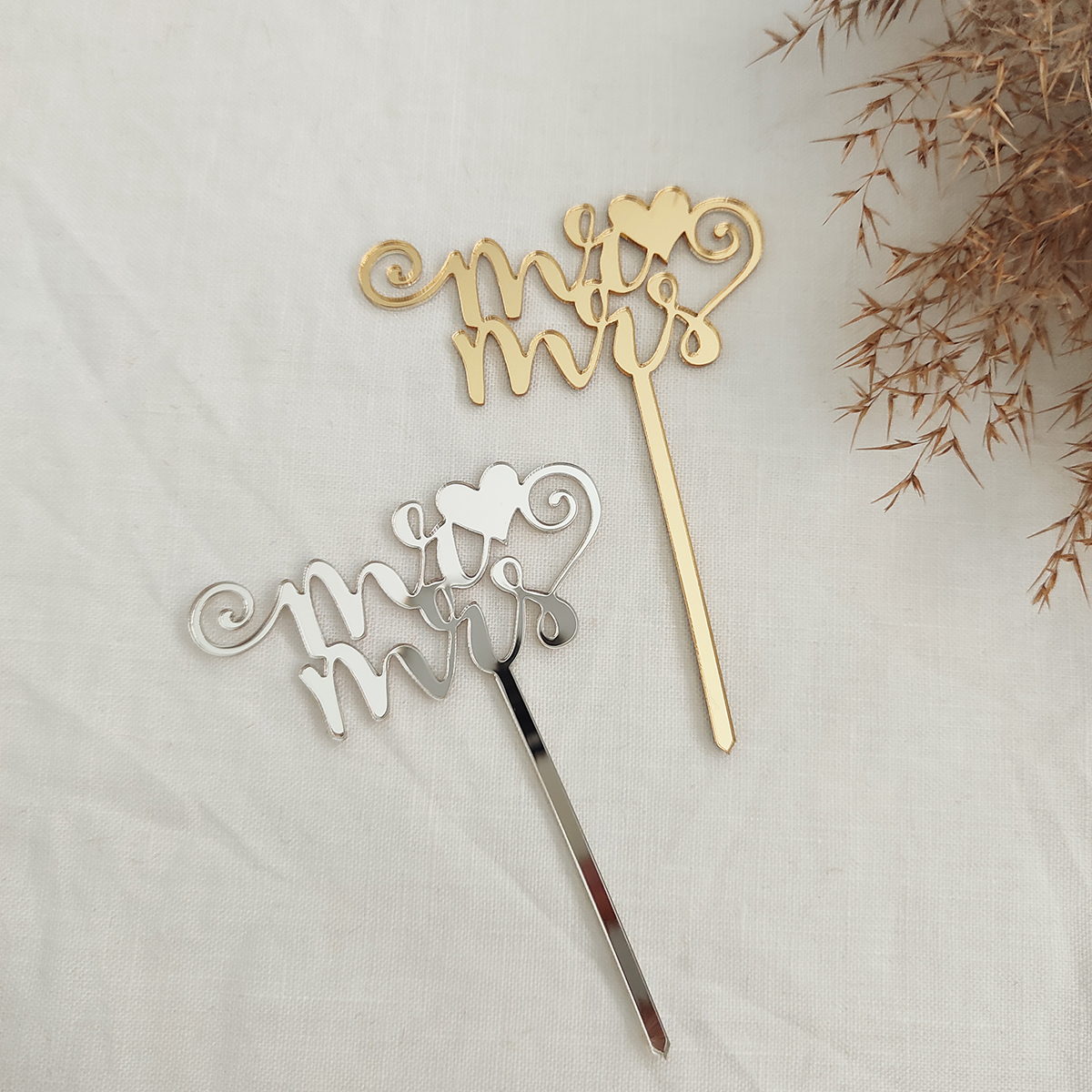 Mini zrkadlový zápich na cupcake s nápisom "Mr&Mrs". Možnosť použiť ako dekoráciu k oslave narodenín, menín, svadby, krstín a pod. Vyrobený zo zlatého alebo strieborného zrkadlového plexiskla.