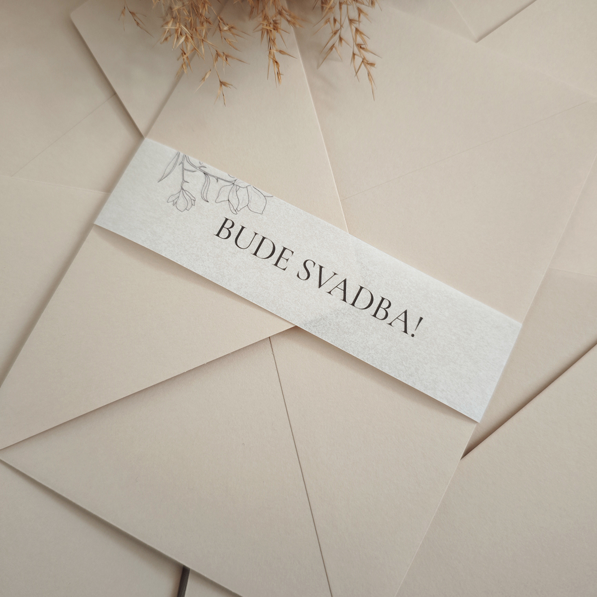 Pásik na obálku vyrobený z pauzovacieho papiera s čiernym textom, doladený k oznámeniam Simple flowers, ale samozrejme si ho môžte zladiť s akýmikoľvek oznámeniami.