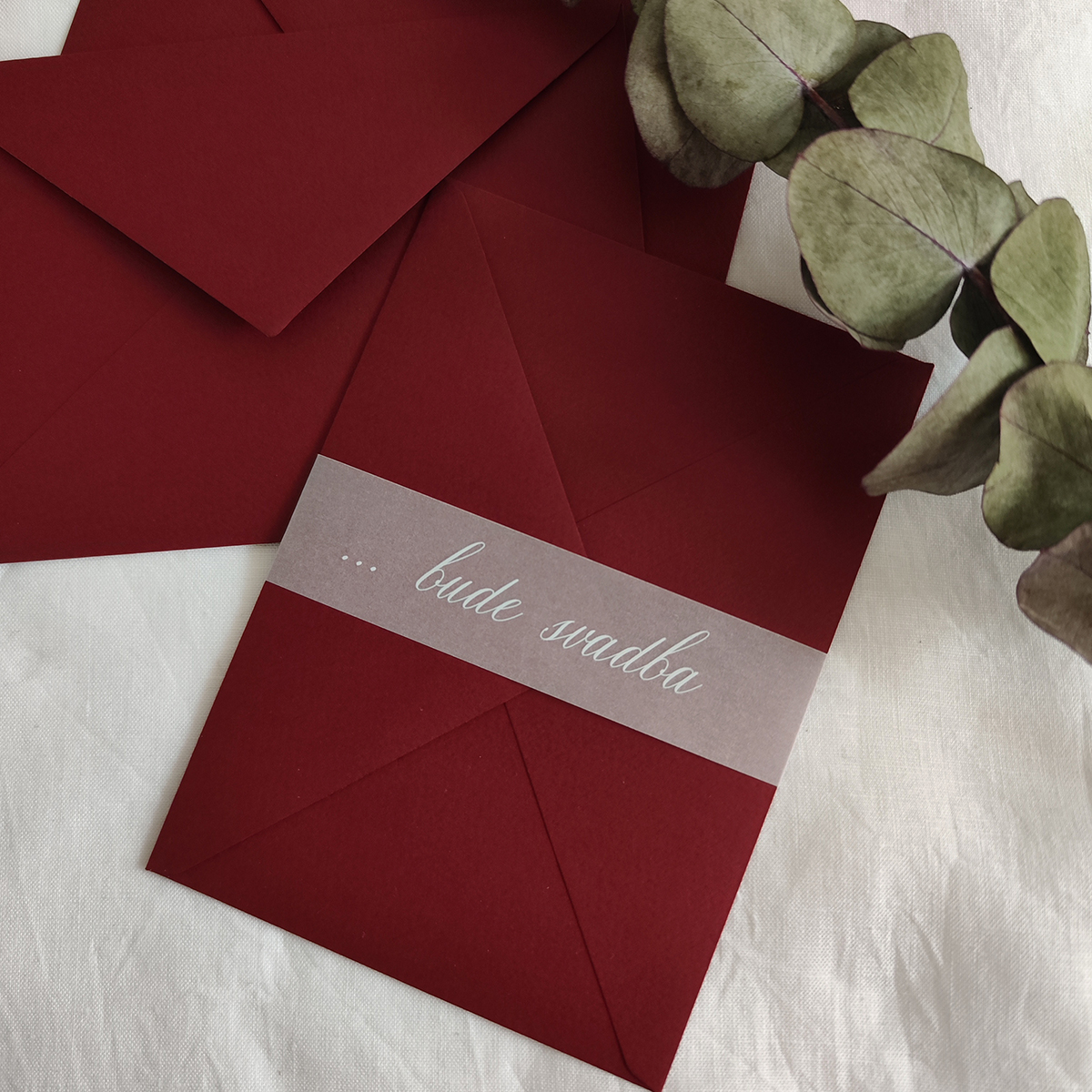 Pásik na obálku vyrobený z transparentného 90g papiera s bielym textom. Písmo na pásiku ladí s oznámeniami Palace white z našej ponuky.