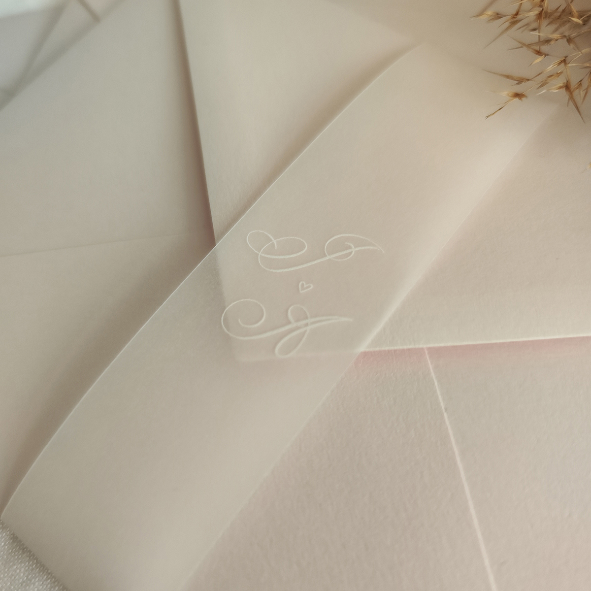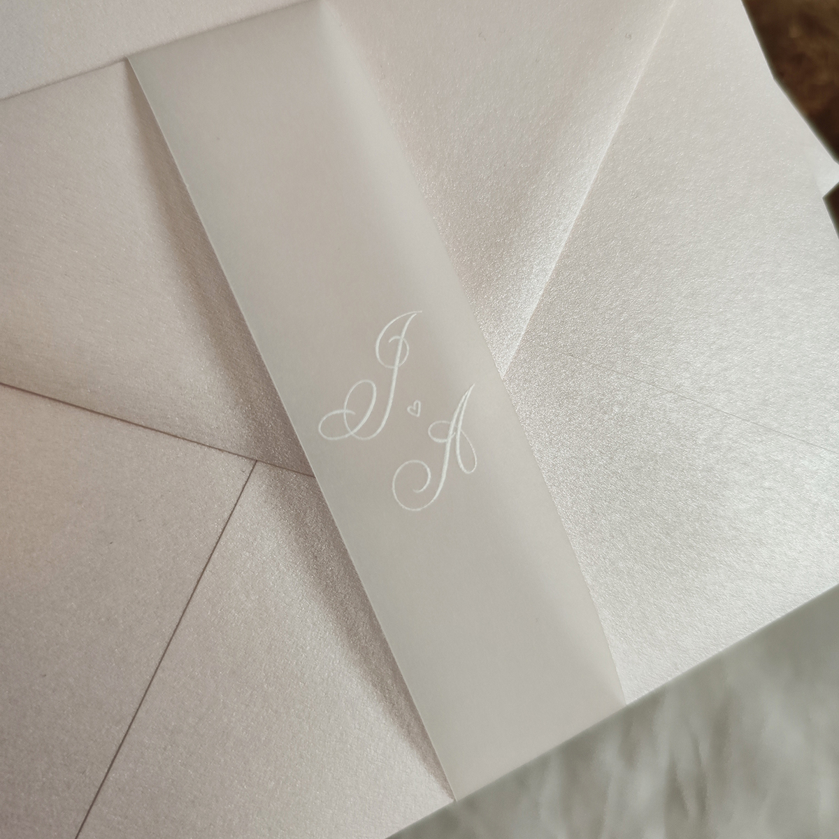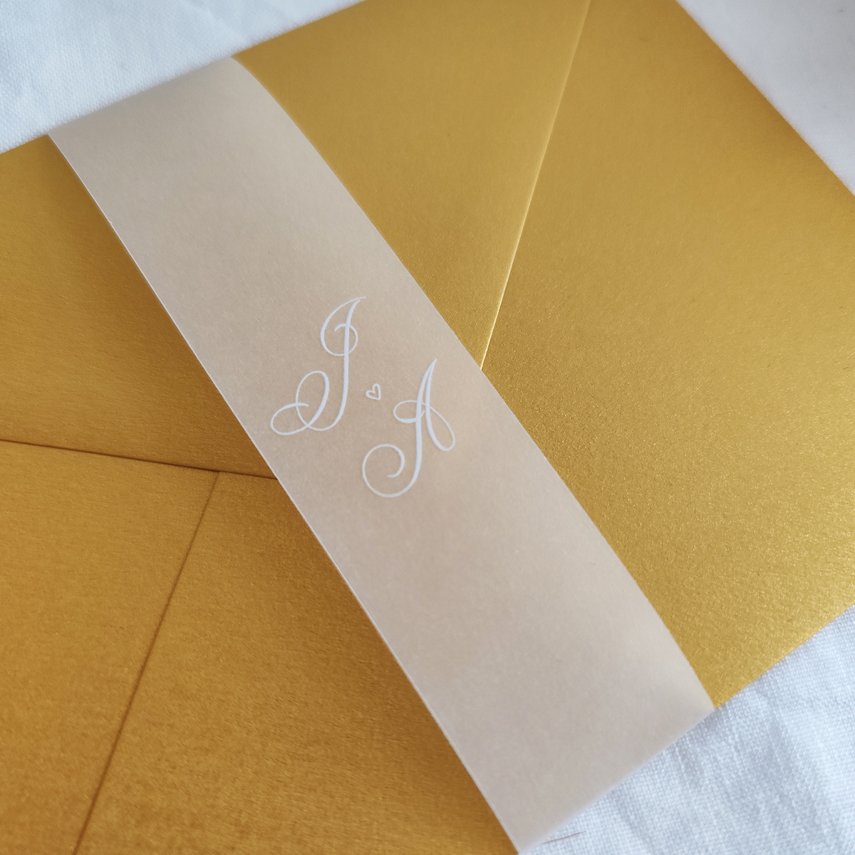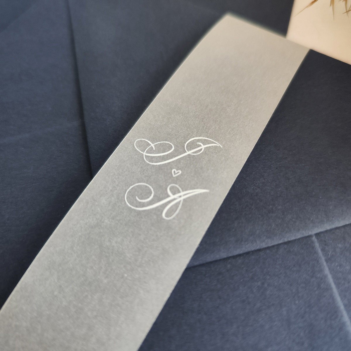 Pásik na obálku vyrobený z transparentného 90g papiera s bielym textom. Písmo na pásiku ladí s oznámeniami Palace white z našej ponuky.