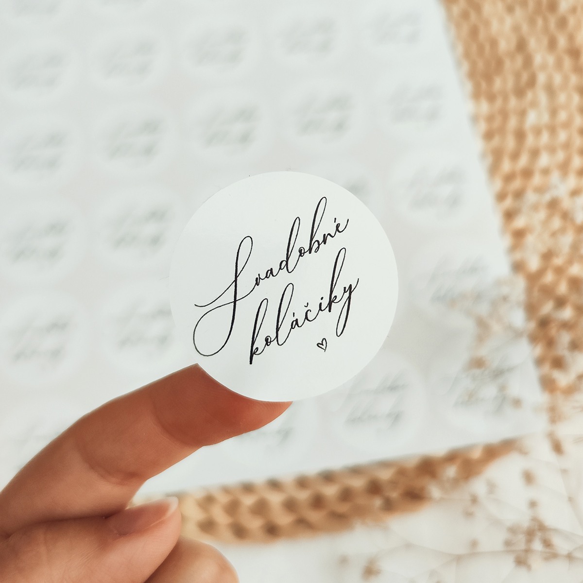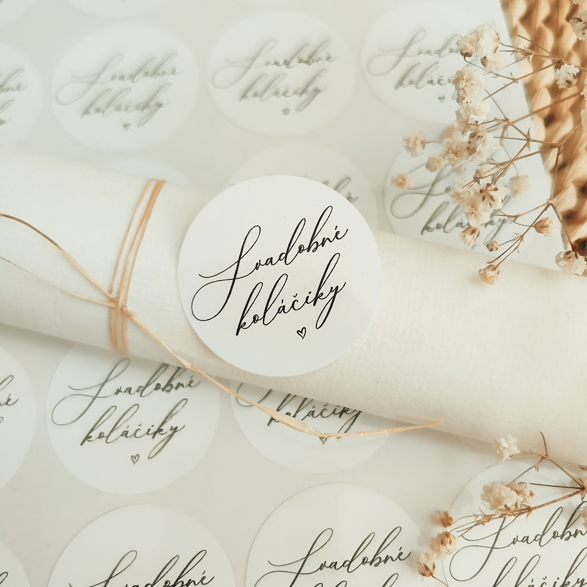 Okrúhlymi nálepkami môžte ozdobiť krabicu so svadobnými koláčikmi. Nálepky sú tlačené UV tlačou na kvalitnú lesklú fóliu. Všetky naše nálepky sú tlačené nezvývateľnou farbou a odolné voči vyblednutiu.