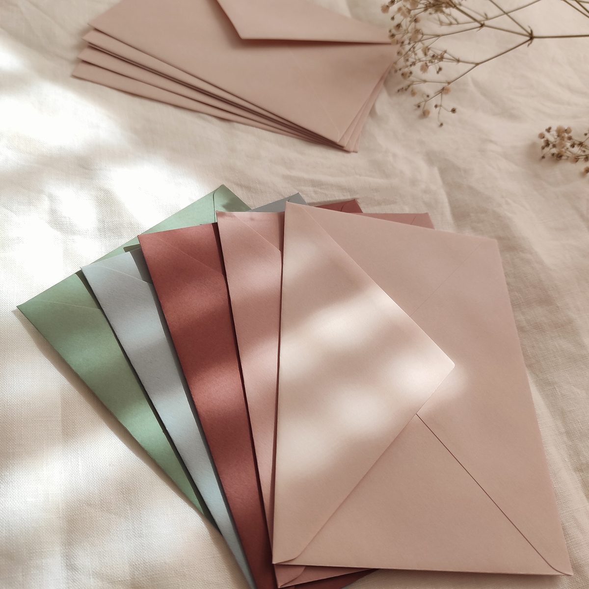Obálka má klasické vlhčiace zatváranie na dlhšej strane a je vyrobená z veľmi kvalitného papiera hrúbky 120 g/m2.