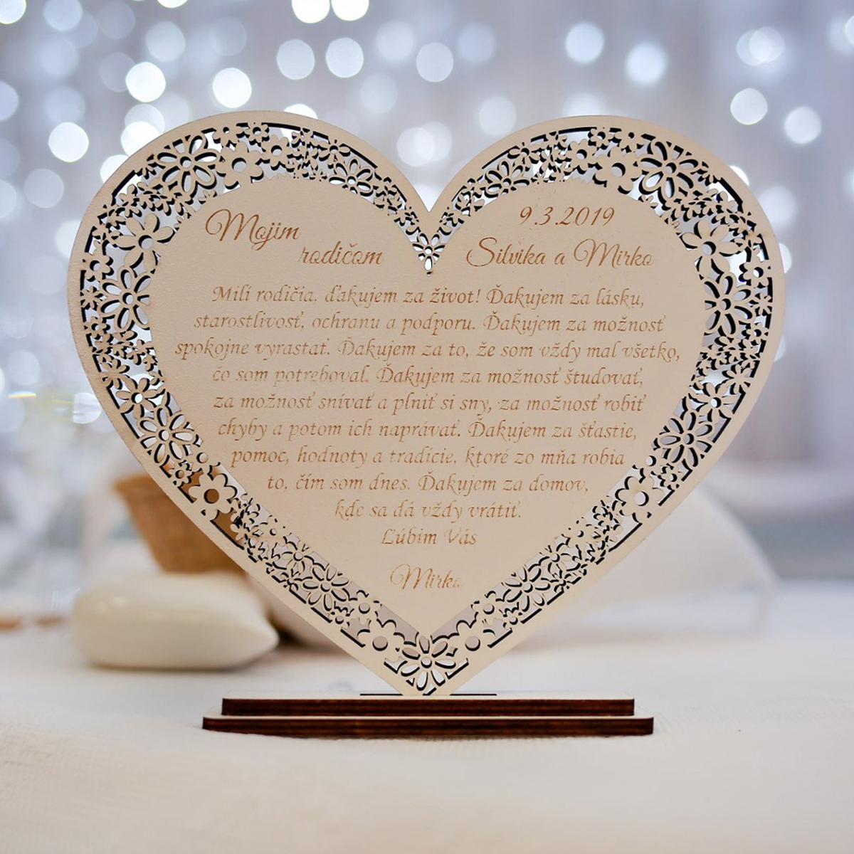 Drevené gravírované srdiečko ako poďakovanie je ideálnym spôsobom ako sa na svadbe poďakovať rodičom za všetko, čo nám v živote dali. Srdiečko vieme upraviť, aby sa dalo použiť napr. aj ako blahoželanie k sviatku, výročiu, vyznanie lásky a pod. Text na srdiečku môžme zmeniť podľa vášho želania. Srdiečka je možné urobiť so stojanom aj bez. Srdiečka so stojanom posielame v zloženom stave, stačí už len položiť na stôl.