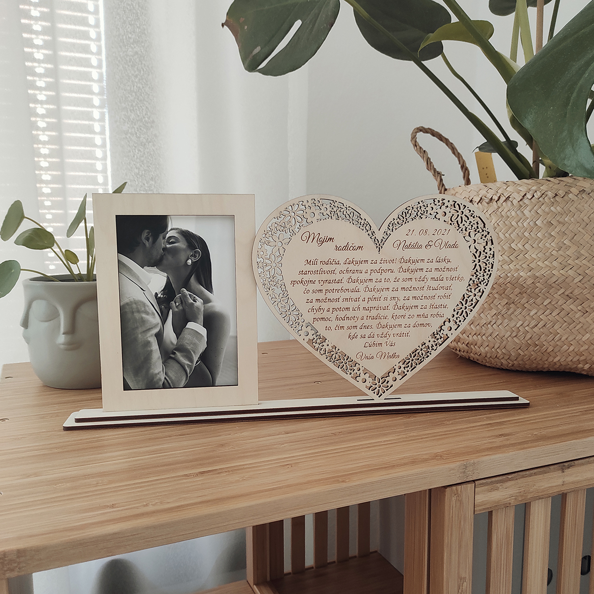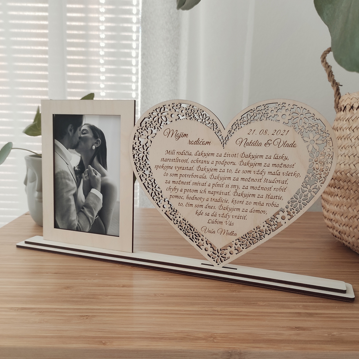 Drevený stojan s gravírovaným srdiečkom ako poďakovanie je ideálnym spôsobom ako sa na svadbe poďakovať rodičom za všetko, čo nám v živote dali. Súčasťou stojanu je aj rámik na fotografiu. Text na srdiečku môžme zmeniť podľa vášho želania.