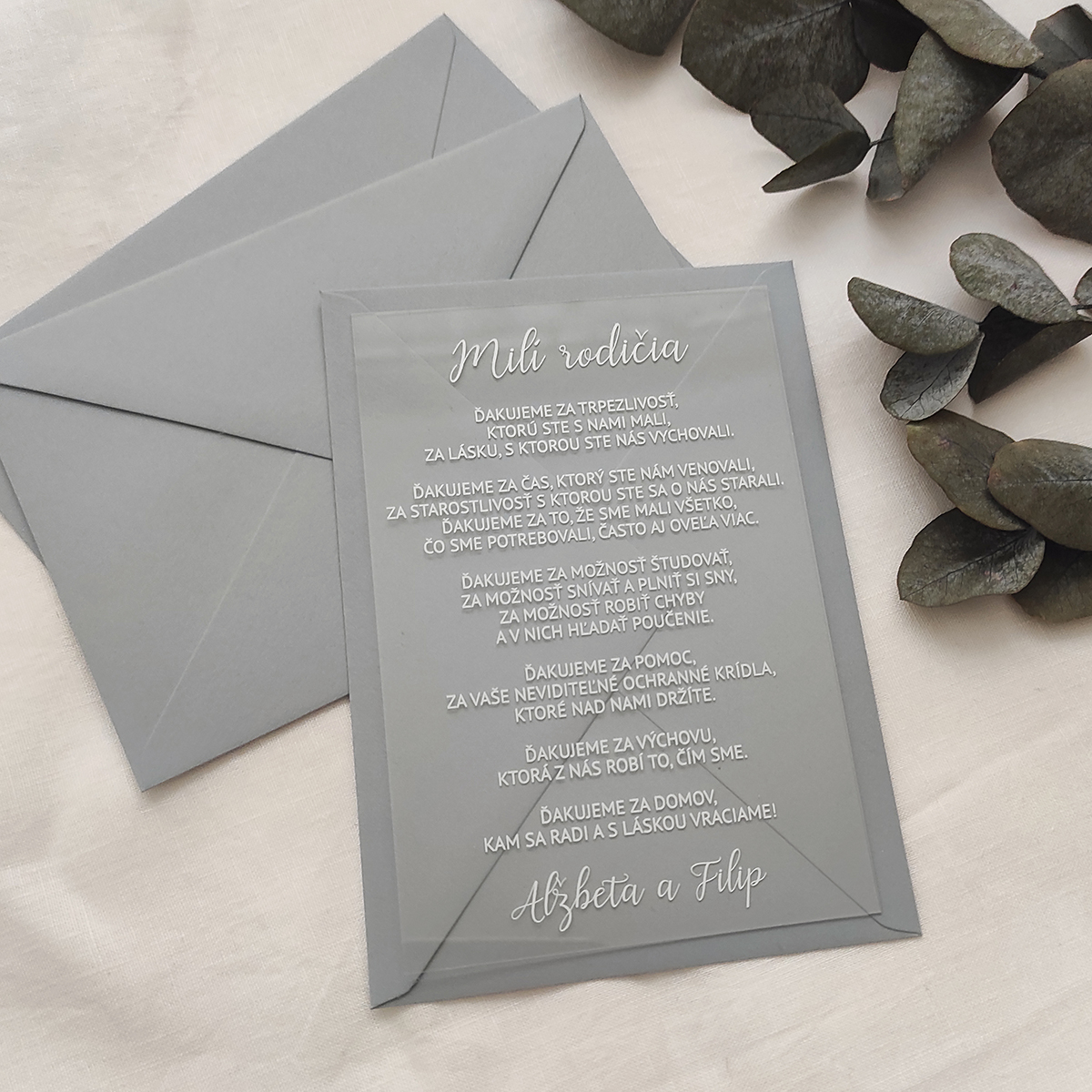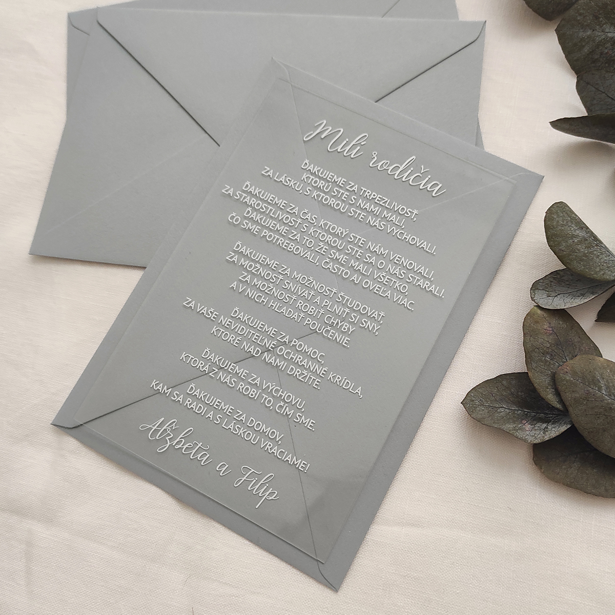 Jednoduché a zároveň veľmi štýlové a moderné transparentné poďakovanie pre svadobných rodičov. Oznámenie je tlačené bielou UV tlačou na transparentné plexi. Vďaka UV tlači je text mierne vystúpený, akoby 3D.