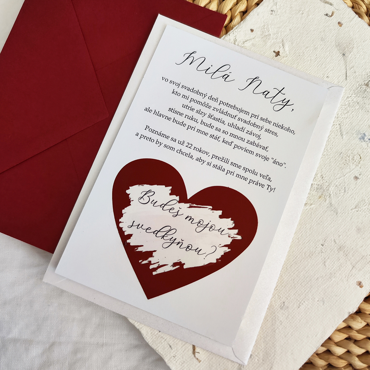 Pozvánka pre svedkyňu alebo družičky s červeným stieracím srdiečkom. Pozvánka je tlačená na 250g matný fotopapier.