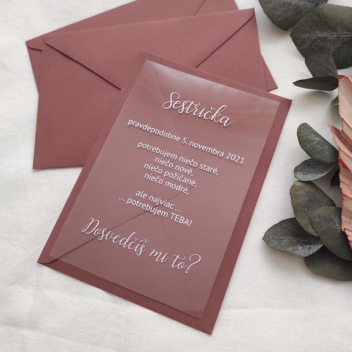 Jednoduché a zároveň veľmi štýlové a moderné transparentné pozvánky pre svedkov alebo družičky. Pozvánka je tlačená bielou UV tlačou na transparentné plexi. Vďaka UV tlači je text mierne vystúpený, akoby 3D.