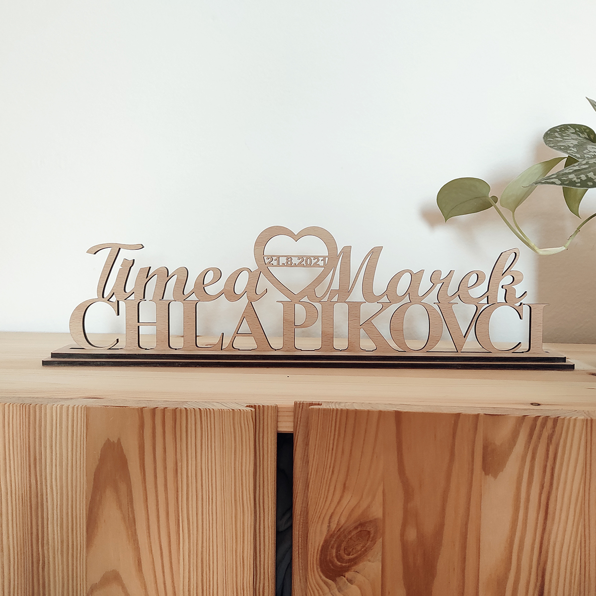 Drevený stojan s menami mladomanželov a dátumom