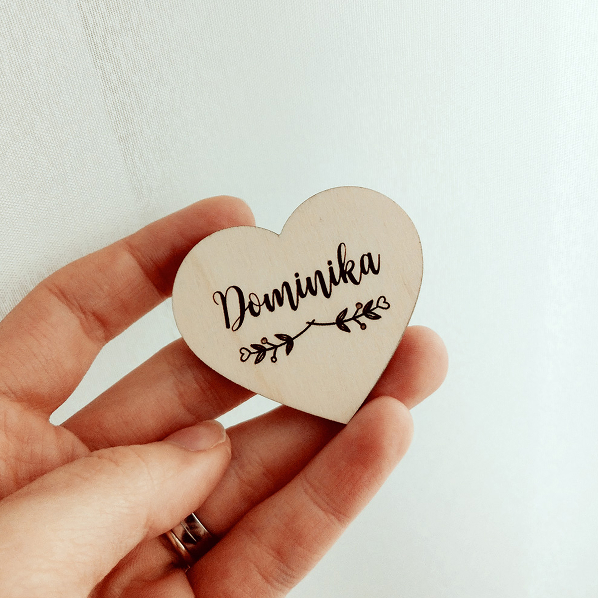 Drevený výrez v tvare srdiečka s vygravírovaným menom doplneným vetvičkou so srdiečkami, ktorý môžte použiť ako menovku na svadbu alebo akúkoľvek inú oslavu. Výrez je vyrezaný z kvalitnej preglejky hrúbky 4mm s prírodným hladkým povrchom.