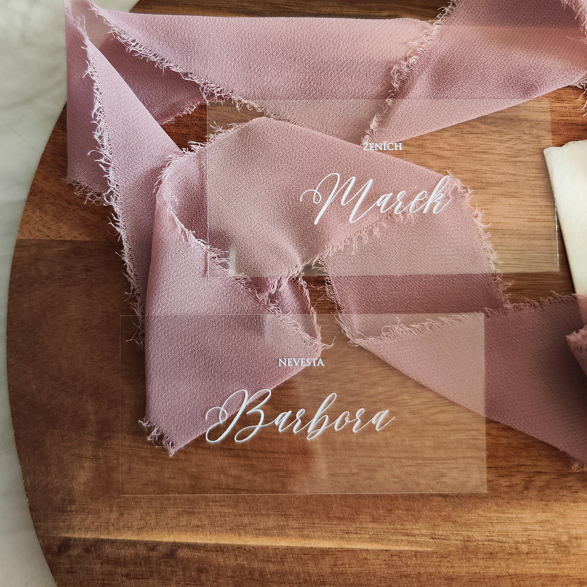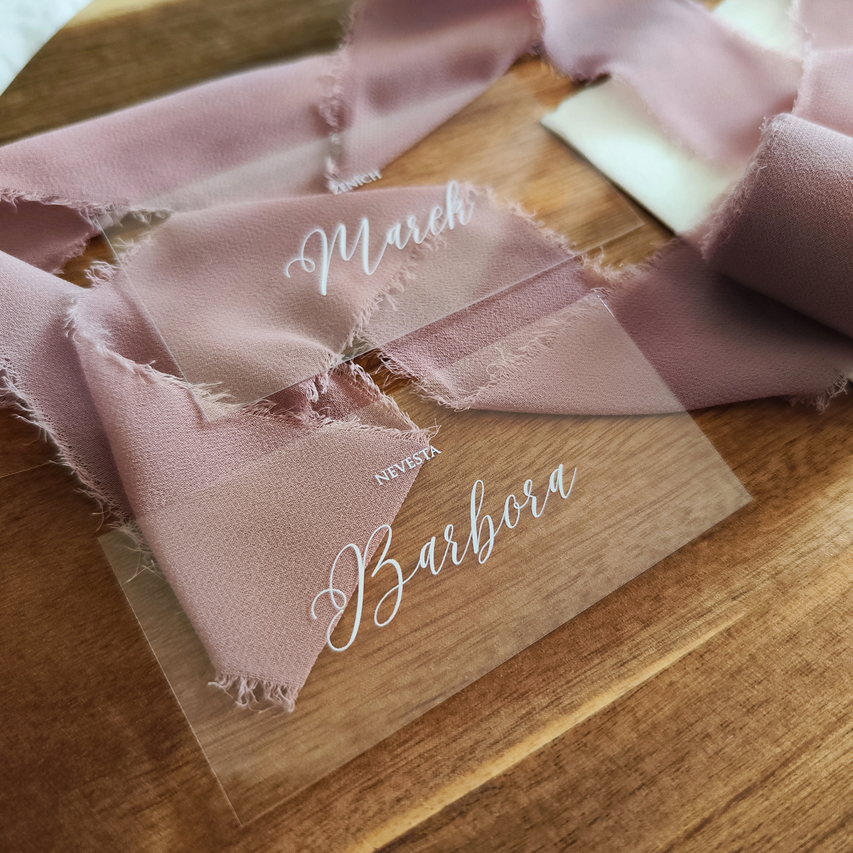 Jednoduchá a zároveň veľmi štýlová a moderná transparentná menovka robená k našim oznámeniam Basic white 1, ale samozrejme si ju môžte kúpiť aj samostatne. Menovky sú tlačené bielou UV tlačou na transparentné plexi. Vďaka UV tlači je text mierne vystúpený, akoby 3D. Farba textu sa dá zmeniť.