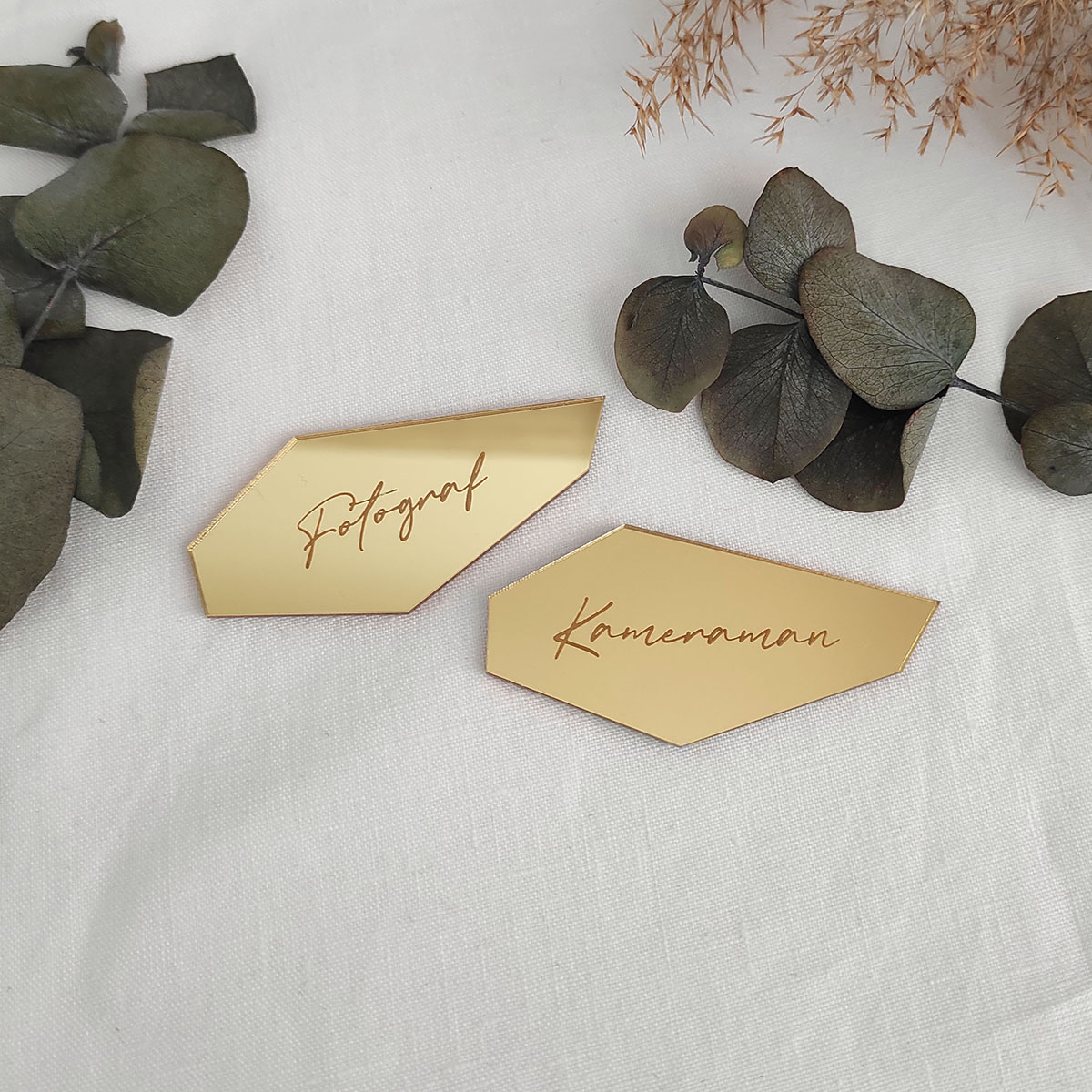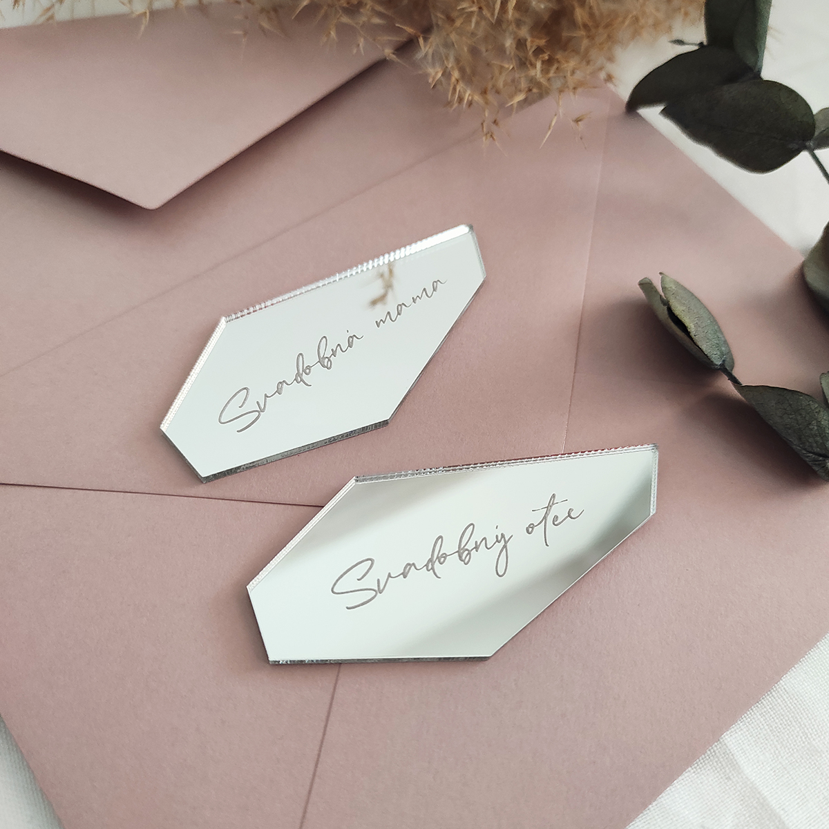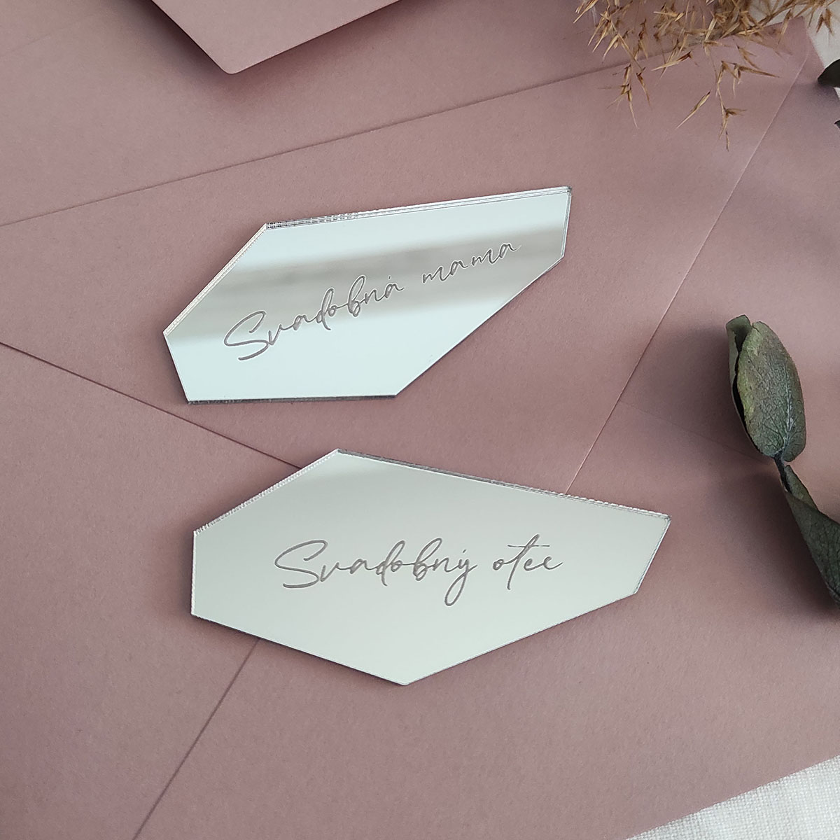 Zrkadlový výrez v tvare črepu s vygravírovaným menom môžte použiť ako menovku na svadbu alebo akúkoľvek inú oslavu. Výrez je vyrezaný z kvalitného zlatého/strieborného plexiskla so zrkadlovým efektom.