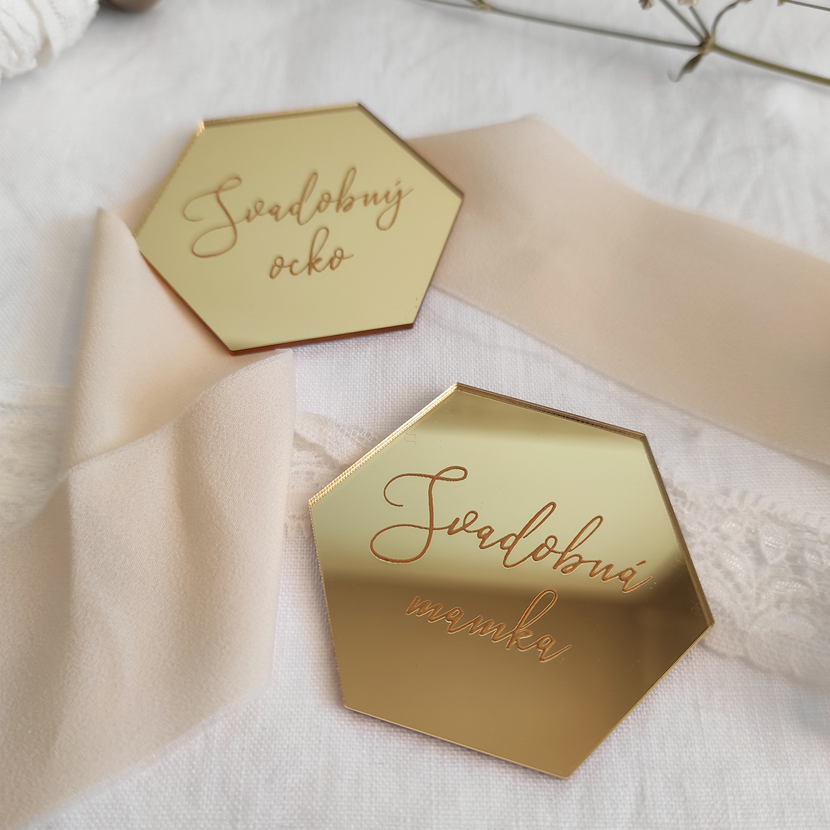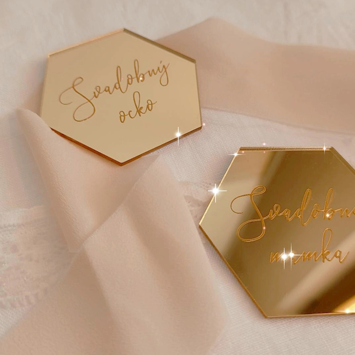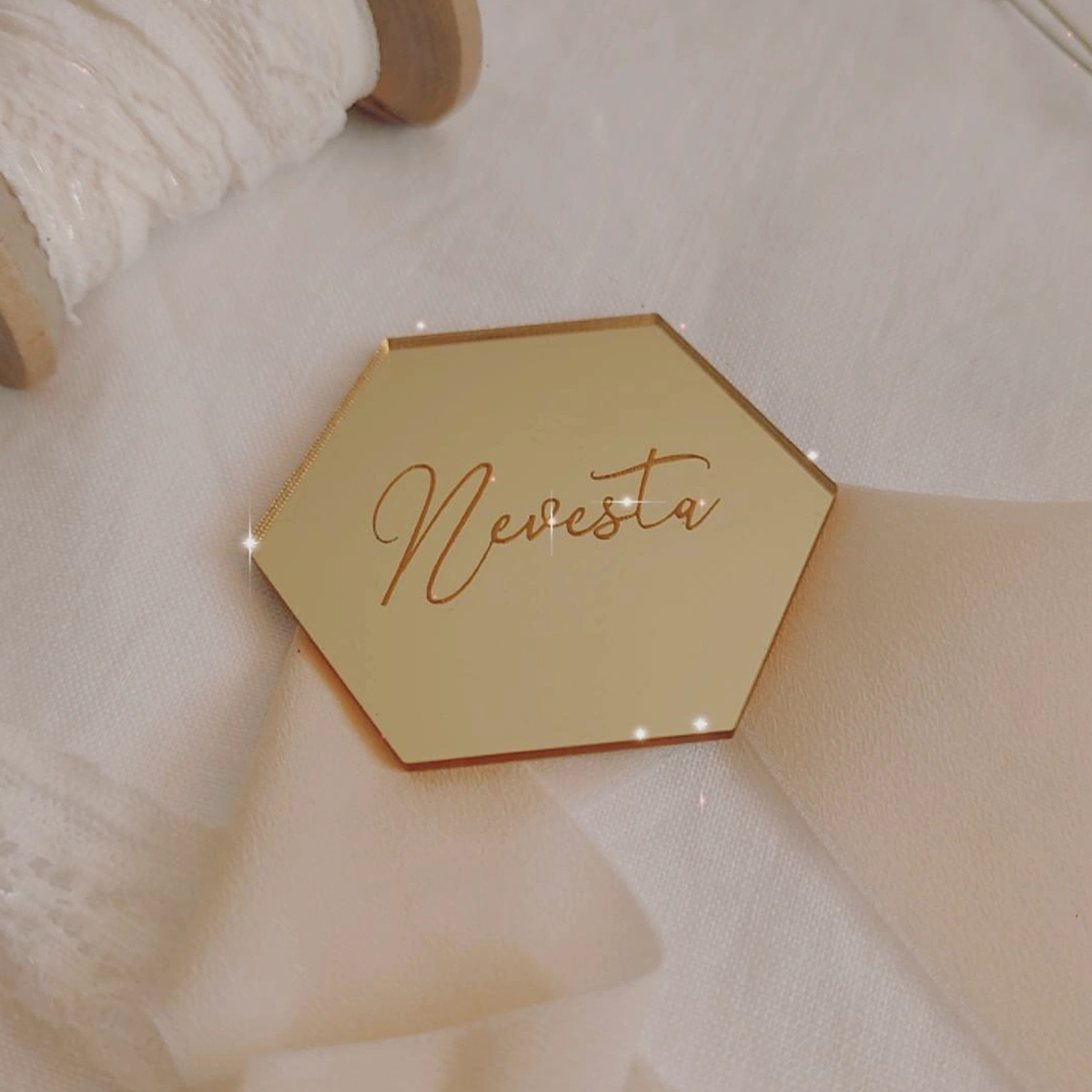 Zrkadlový výrez v tvare kruhu s vygravírovaným menom môžte použiť ako menovku na svadbu alebo akúkoľvek inú oslavu. Výrez je vyrezaný z kvalitného zlatého/strieborného plexiskla so zrkadlovým efektom.