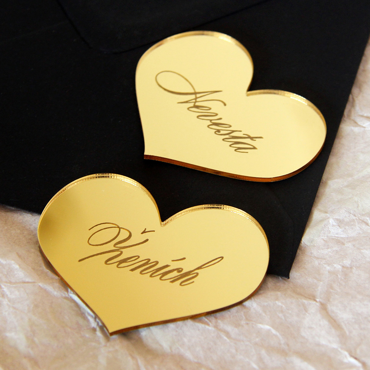 Zrkadlový výrez v tvare srdiečka s vygravírovaným menom môžte použiť ako menovku na svadbu alebo akúkoľvek inú oslavu. Výrez je vyrezaný z kvalitného zlatého/strieborného plexiskla so zrkadlovým efektom.