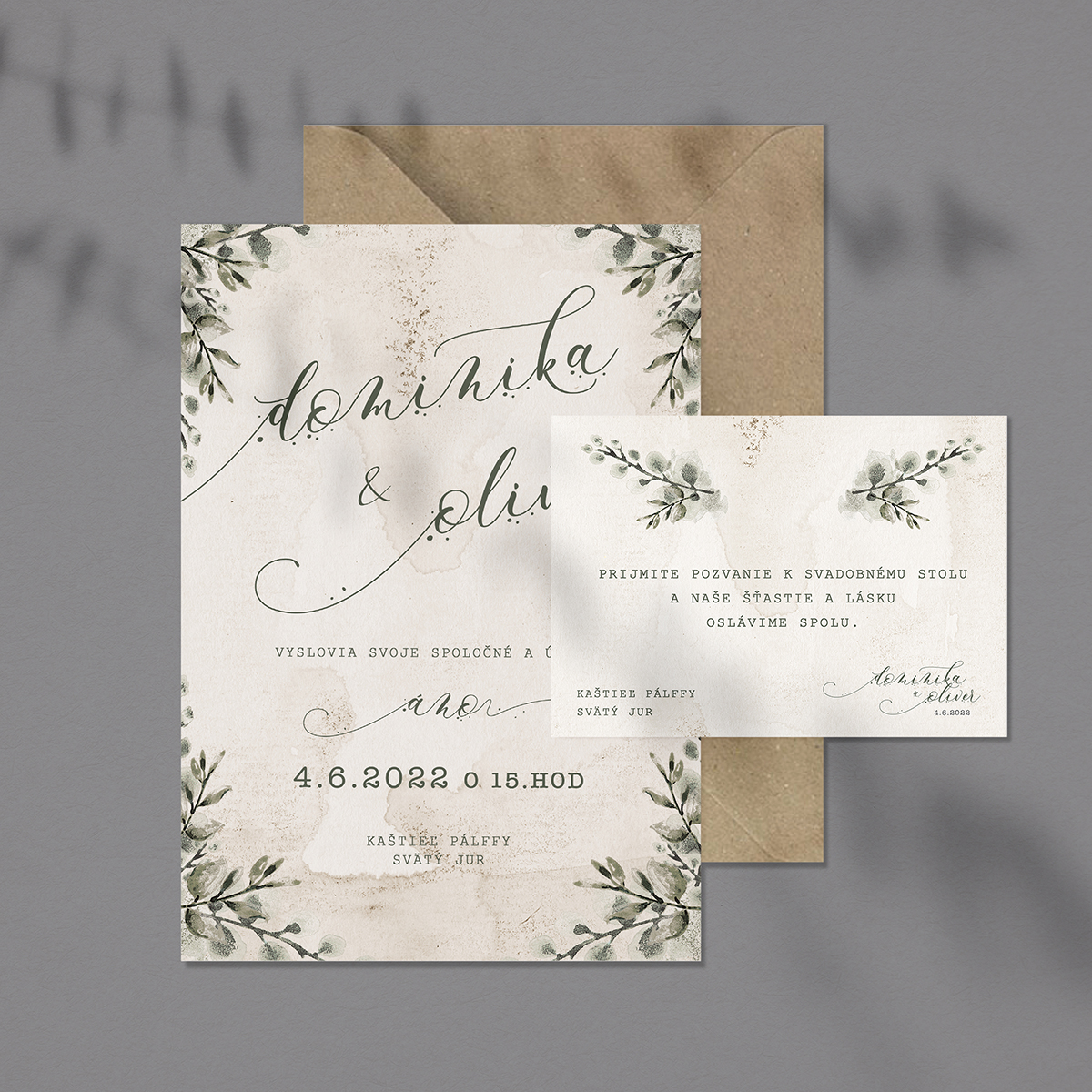 Svadobné oznámenie Grey green tlačené jednostranne na hladký matný biely fotopapier, hrúbka 240 gramov. Text prispôsobíme podľa vašich predstáv.