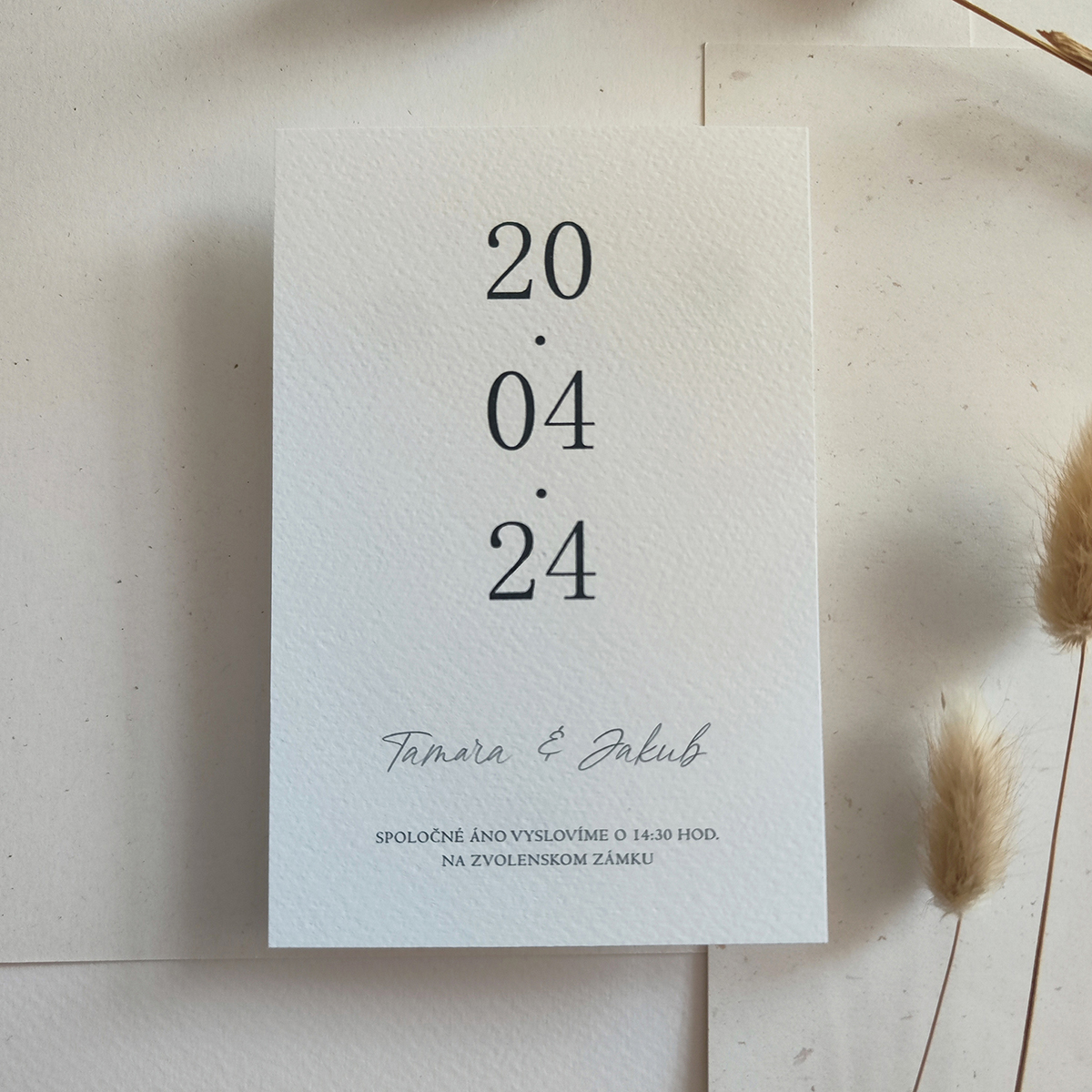 Svadobné oznámenie v jednoduchom štýle tlačené na kreatívny ekologický štrukturovaný papier. Papier je vyrábaný vo Francúzsku a má výnimočnú vlastnosť, že pôsobí hrubšie a pevnejšie ako ostatné papiere s rovnakou gramážou.