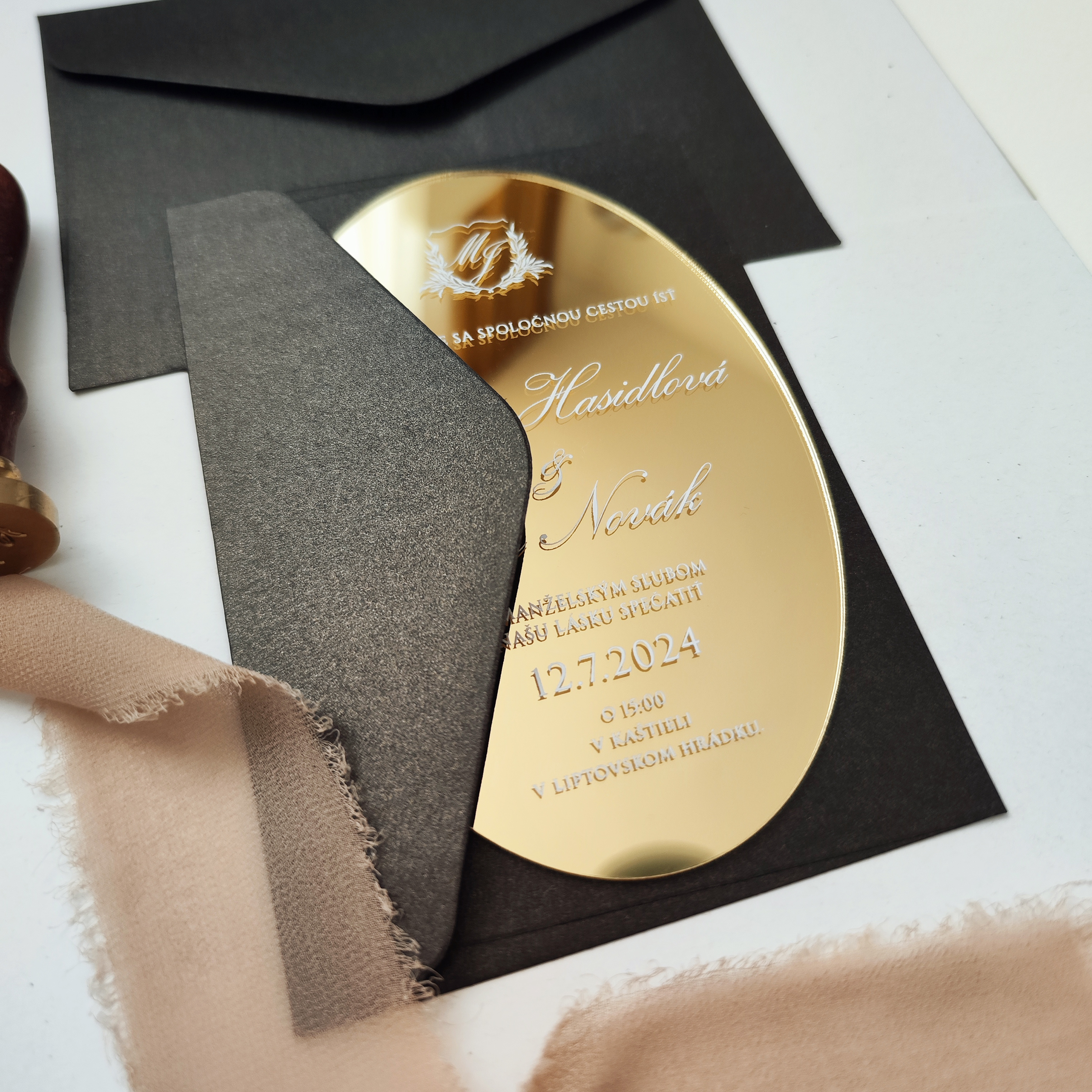 ideatree, oznámenie, svadba, svadobné oznámenie, luxusné oznámenie, zrkadlové oznámenie, zlaté oznámenie, transparentné, oznámenie s bielym textom, nové mesto nad váhom