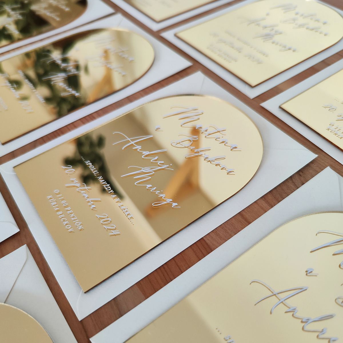 Luxusné a moderné svadobné oznámenie tlačené bielou na zrkadlové plexi v zlatej alebo striebornej farbe.