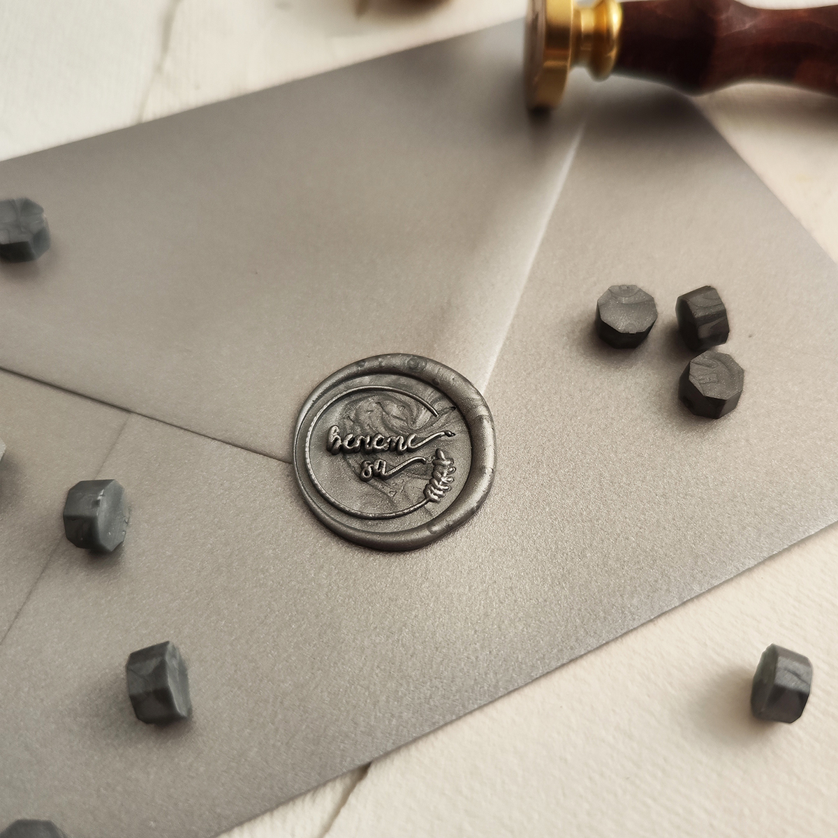 Hotové pečate z pečatného vosku s nápisom Berieme sa. Pečate majú zo zadnej strany nálepku, ktorú jednoducho odlepíte a nalepíte pečať napr. na obálku.