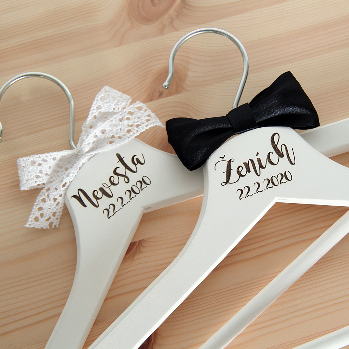 Svadobné vešiaky s vygravírovaným textom nevesta a ženích a dátumom