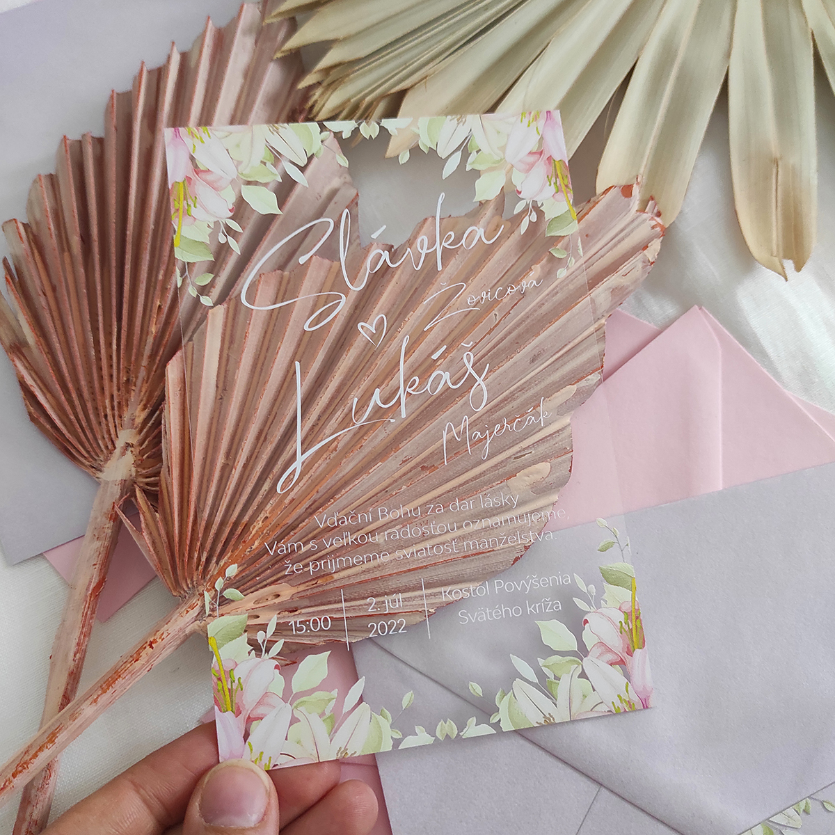 Transparentné svadobné oznámenie s kvetmi tlačené farebnou UV tlačou na transparentné plexi. Vďaka UV tlači je text mierne vystúpený, akoby 3D.