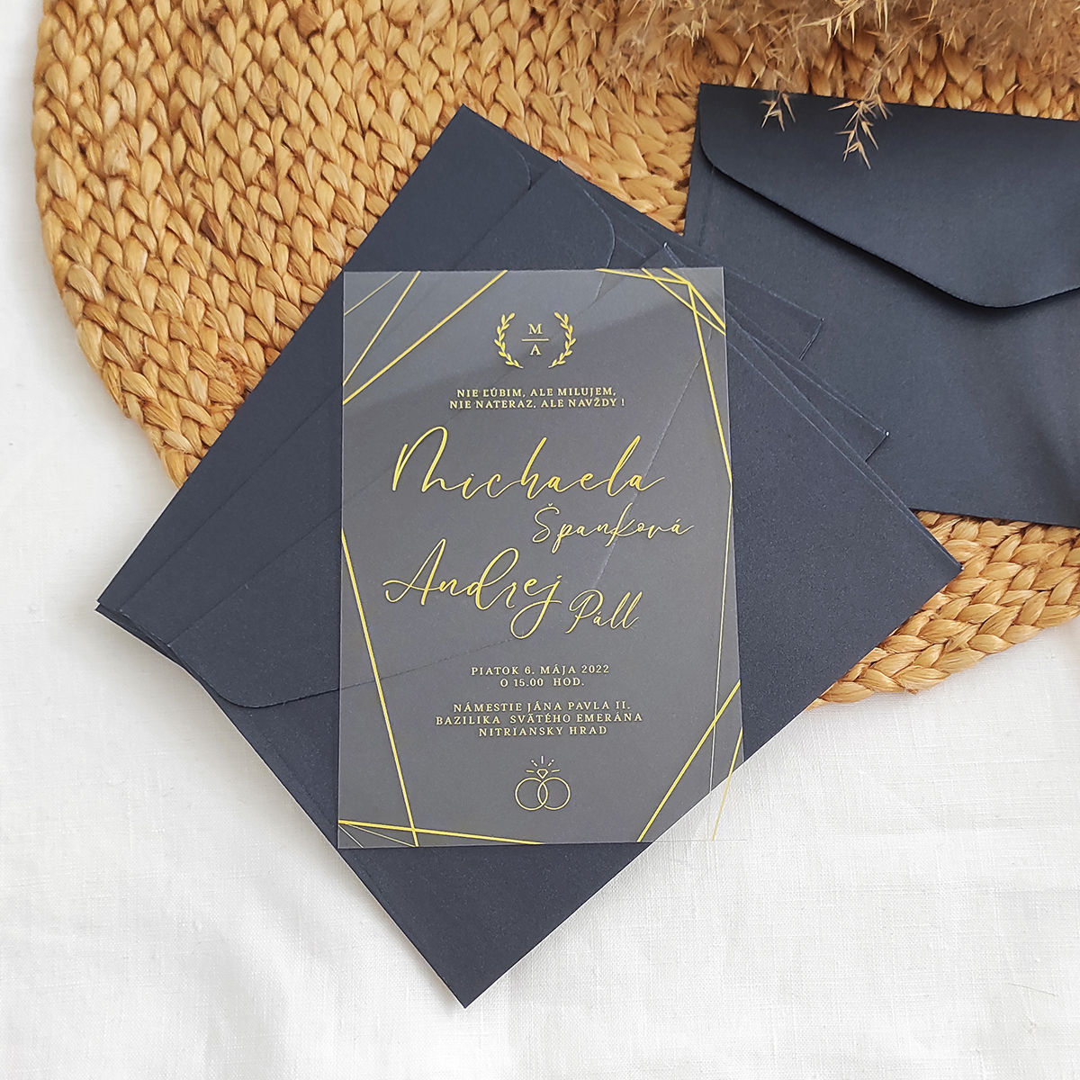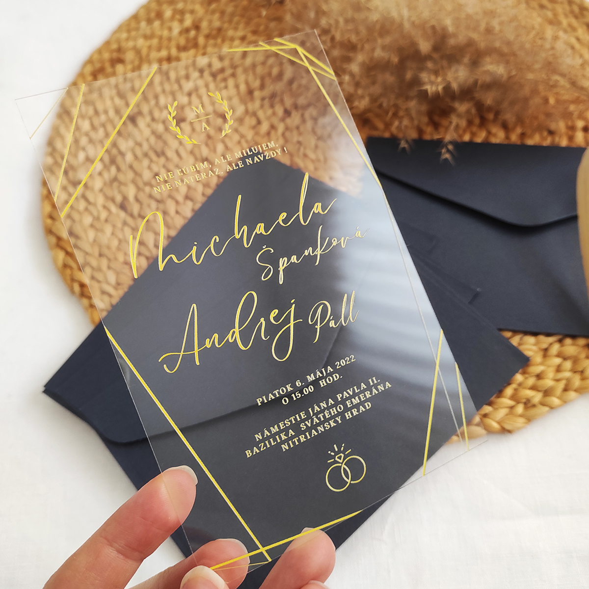 Transparentné svadobné oznámenie so zlatými linkami tlačené farebnou UV tlačou na transparentné plexi. Vďaka UV tlači je text mierne vystúpený, akoby 3D. Zlatá farba nie je metalická!