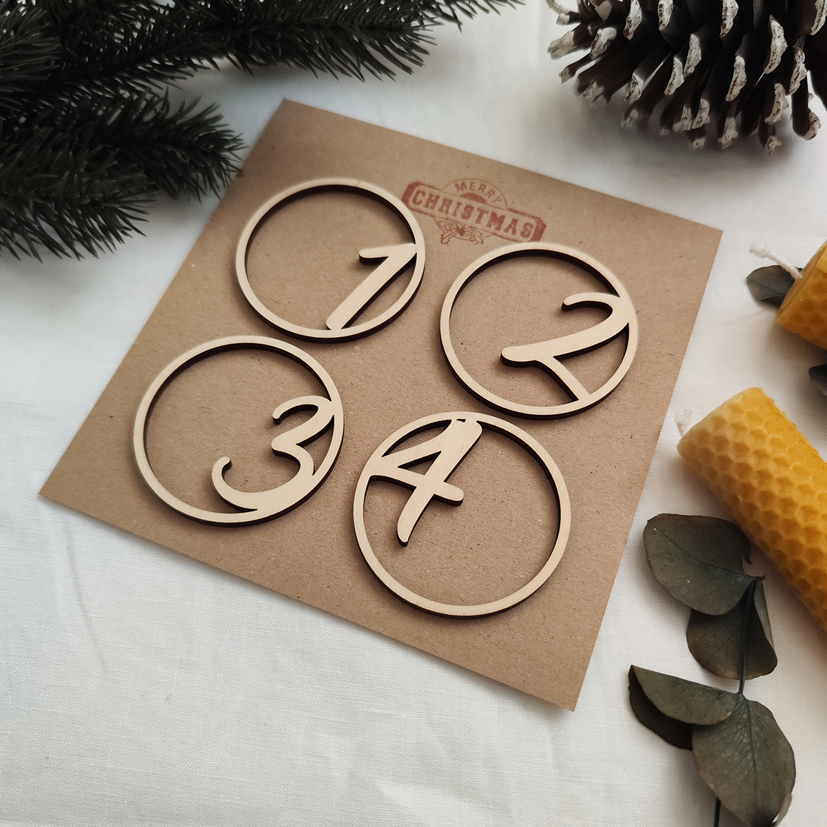 Drevené čísla na adventný veniec v kruhu. Čísla môžte pripevniť na klasický veniec alebo zavesiť na sviečky. Čísla sú vyrobené z kvalitnej preglejky hrúbky 4mm s prírodným hladkým povrchom.