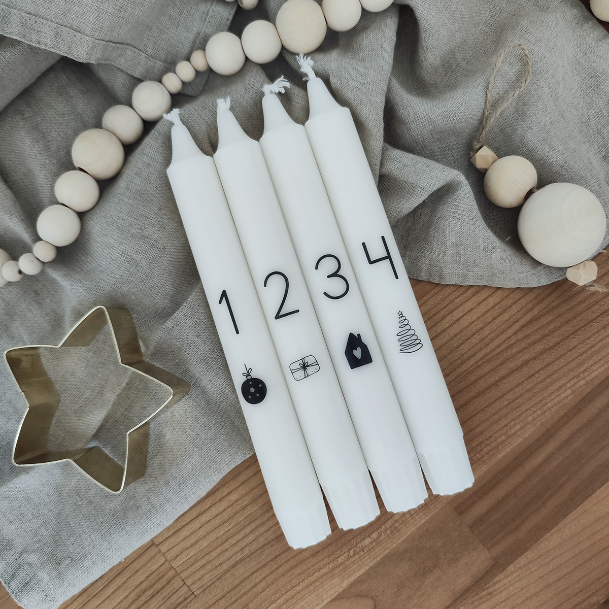 Sviečky na adventný veniec potlačené v našej dielni číslami od 1 do 4 a vianočnými obrázkami. Dole sú zúžené pre lepšie zapadnutie do svietnika. 1 sviečka vydrží horieť 7 hodín. Zloženie: 100% živočíšny stearín.