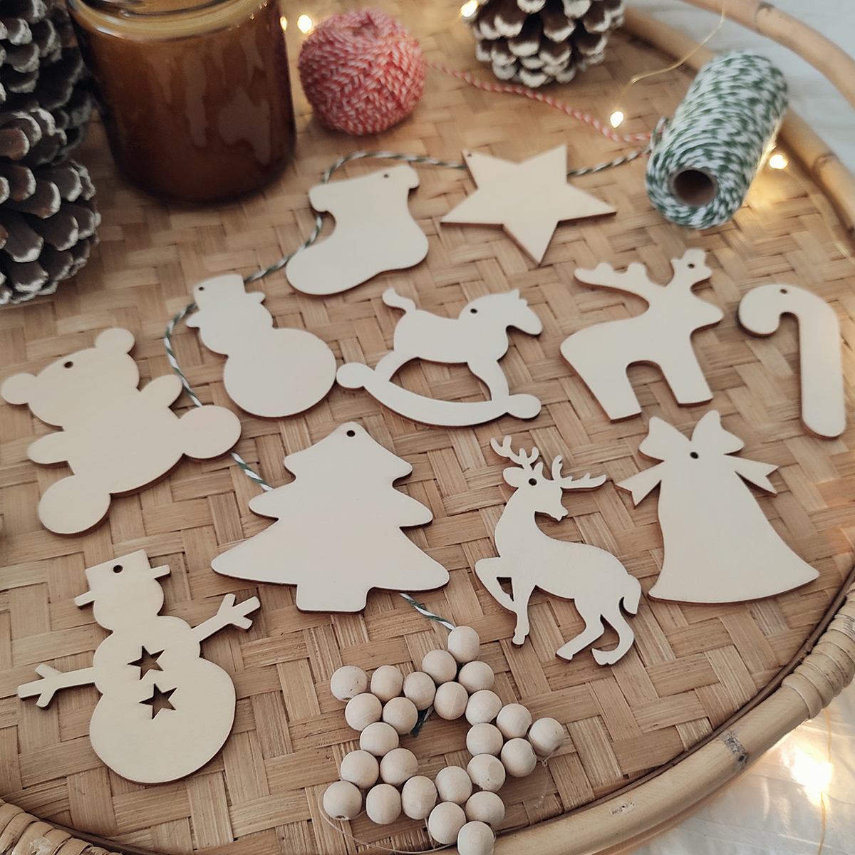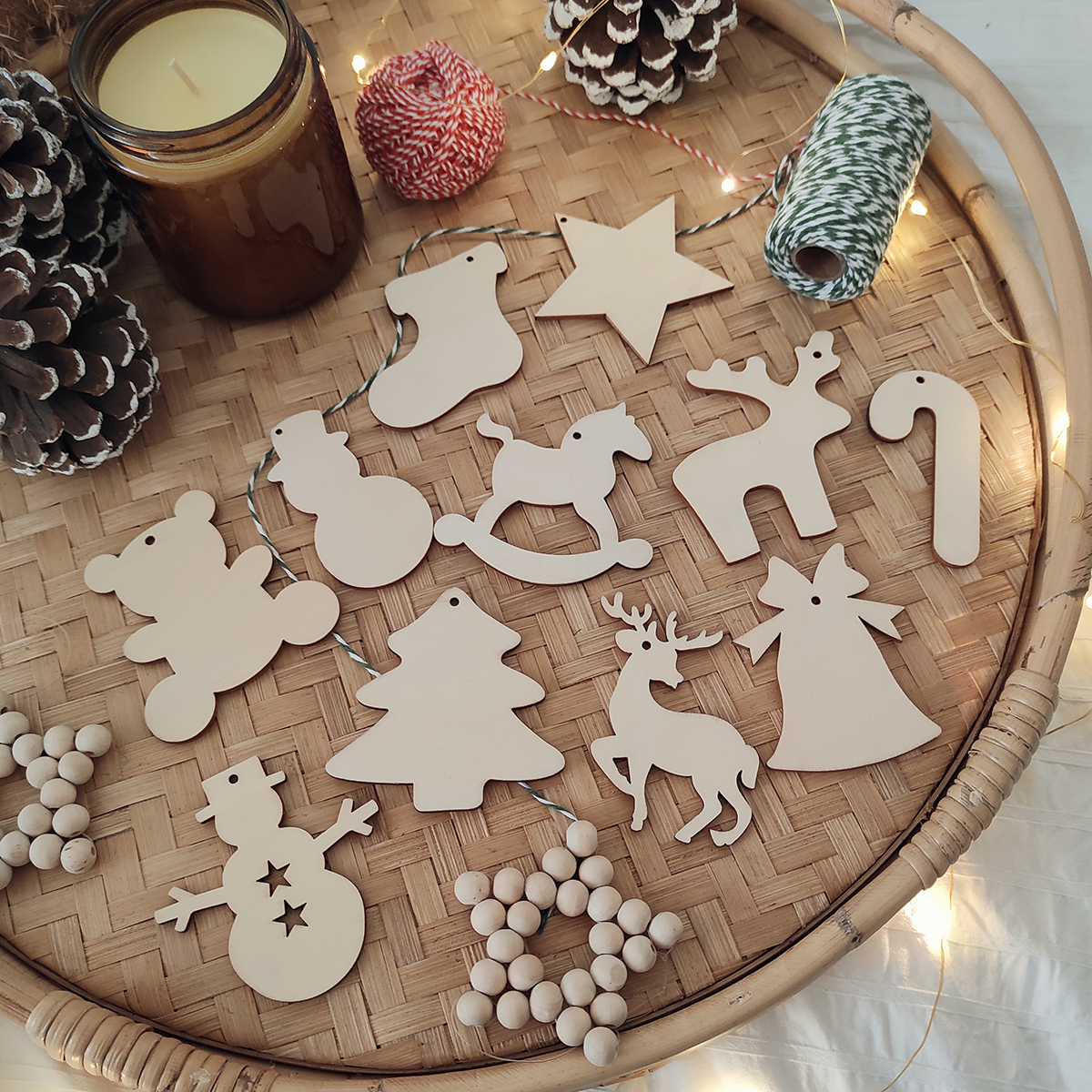 Vianočné ozdôbky sú vyrezané z preglejky hrúbky 2mm. Povrch je prírodný, neupravovaný.
