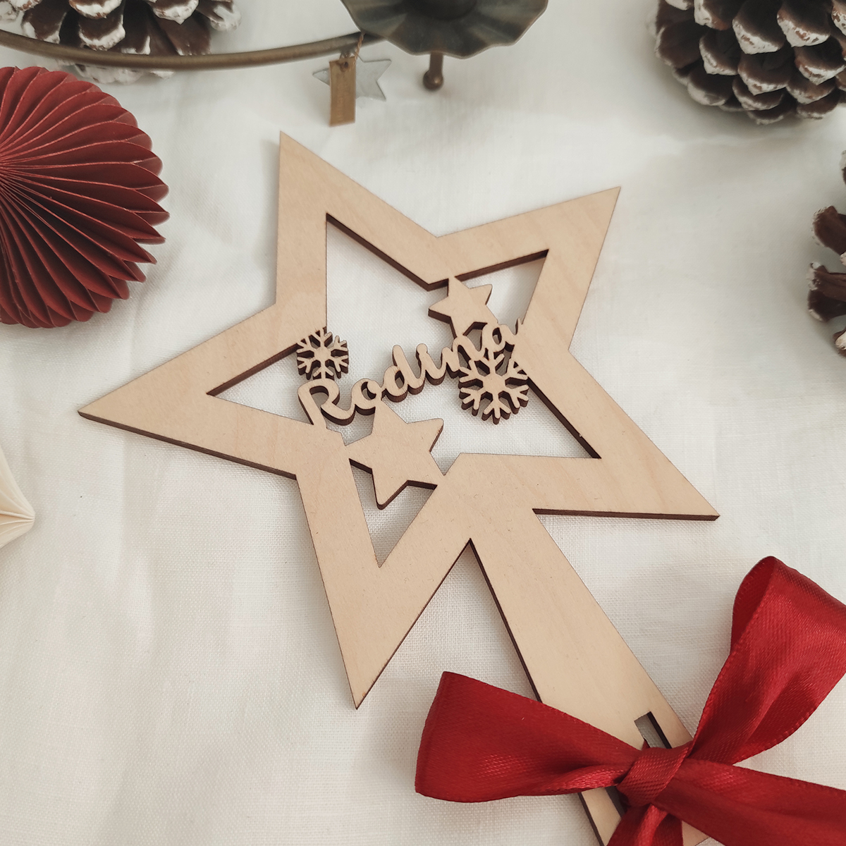 Drevená hviezda na vrch stromčeka s textom Rodina. Súčasťou hviezdy je aj stužka, pomocou ktorej si hviezdu priviažete na vrchol stromčeka.