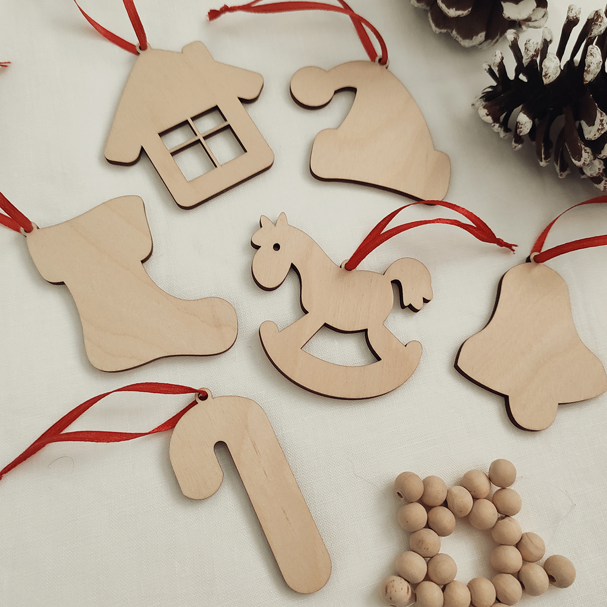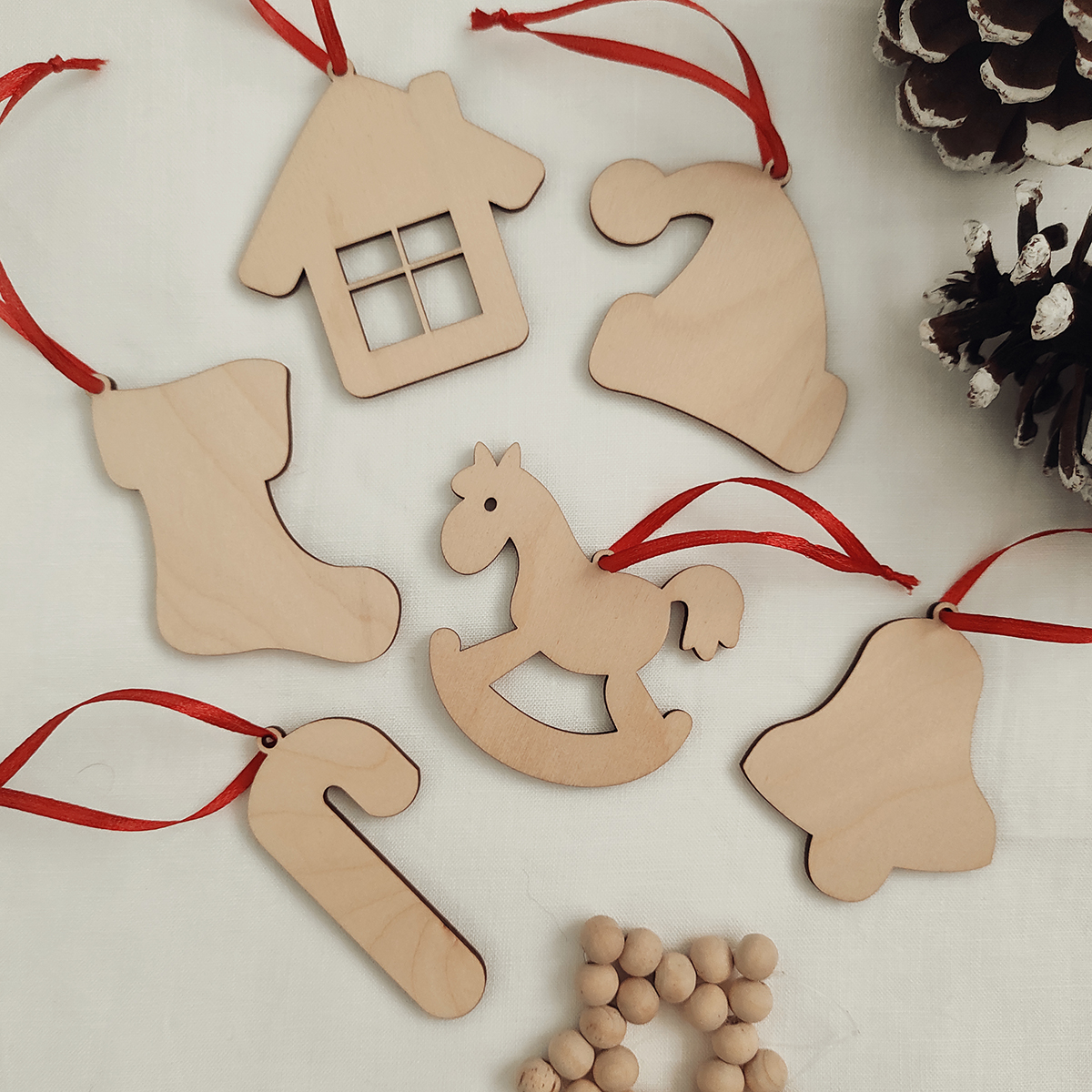 Sada 6 ks drevených vianočných ozdôb s červenou stužkou. Sada je dodávaná v darčekovom balení. Ozdôbky tak môžte darovať.