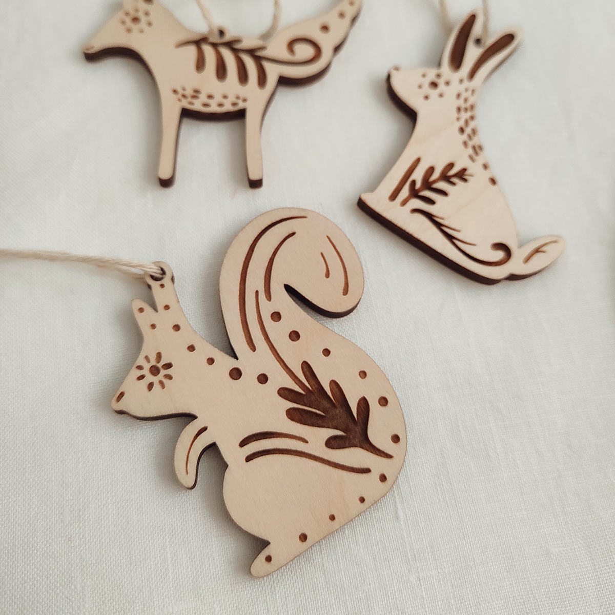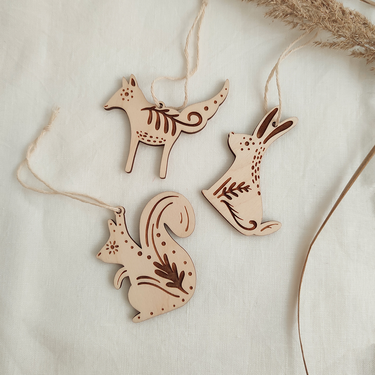 Sada 3 ks drevených gravírovaných ozdôb s lesnými zvieratkami. Sada je dodávaná v darčekovom balení. Ozdôbky tak môžte darovať. Ozdoby nemusíte využiť len ako vianočné. Budú krásne aj zavesené na jarnej alebo jesennej vetvičke vo váze.