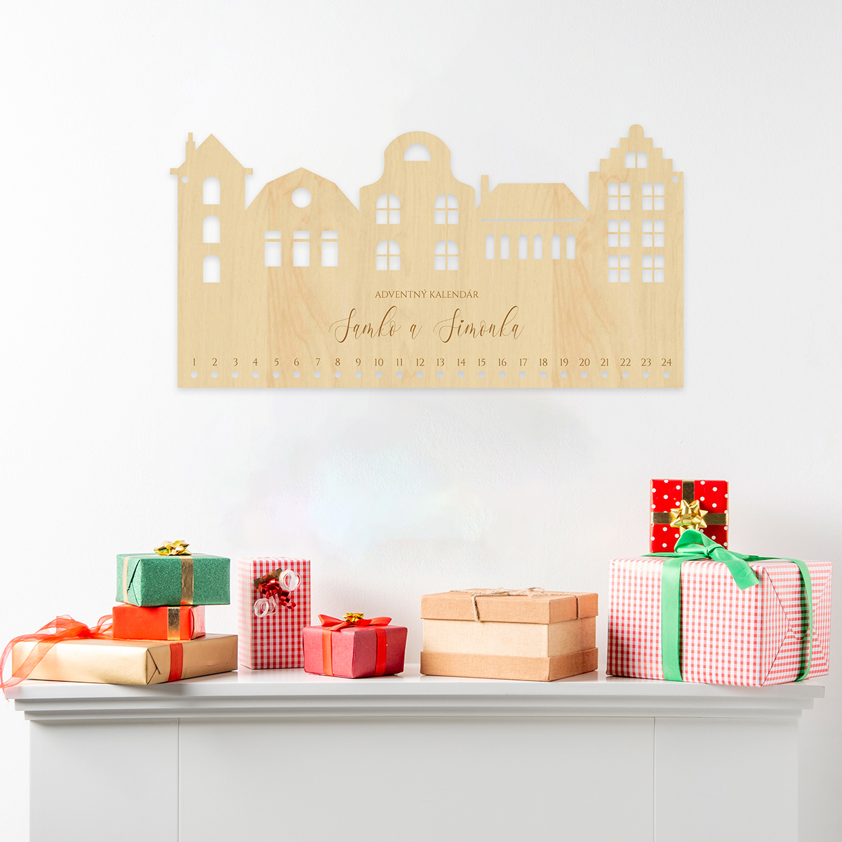 Personalizovaný adventný kalendár do detskej izby v tvare mestečka s menom dieťatka. Kalendár je vyrobený z tej najkvalitnejšej drevenej preglejky hrúbky 4mm.