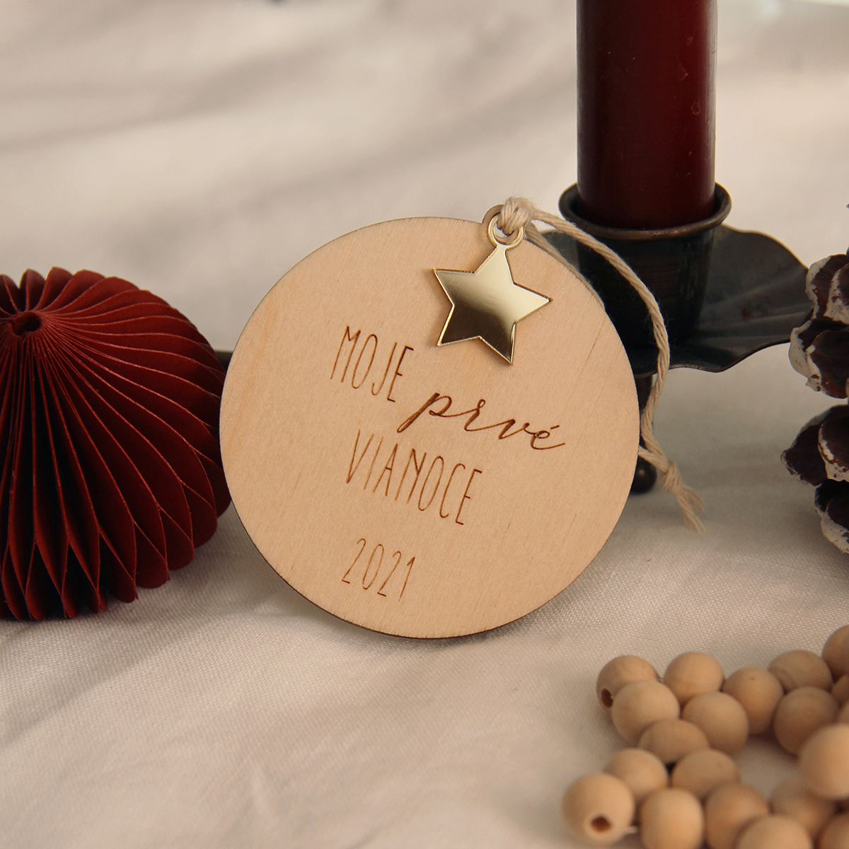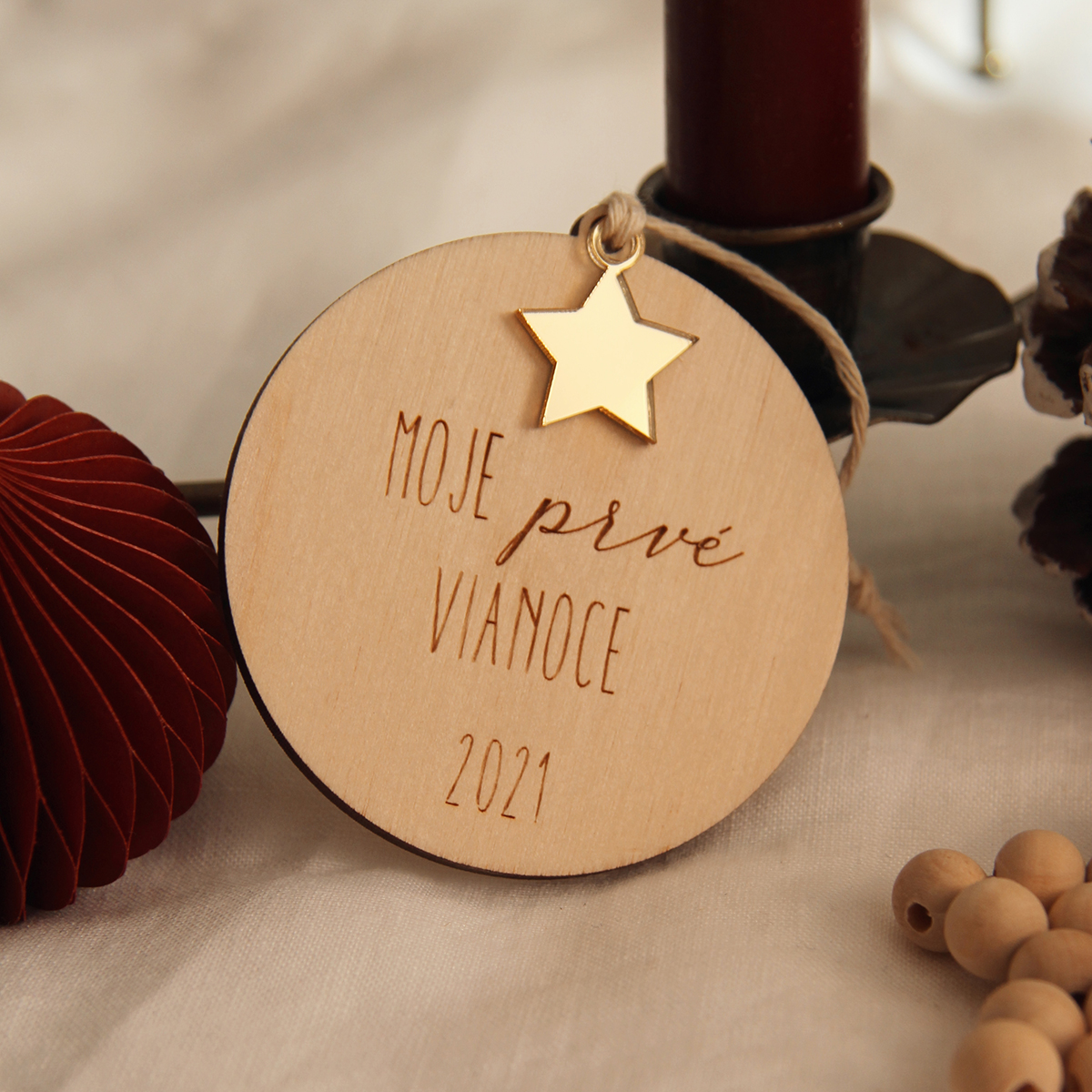 Táto jedinečná personalizovaná ozdoba je vyrobená z preglejky hrúbky 4mm, povrch je prírodný, prebrúsený do hladka. Guľa je doplnená o zlatú alebo striebornú hviezdičku zo zrkadlového plexiskla.