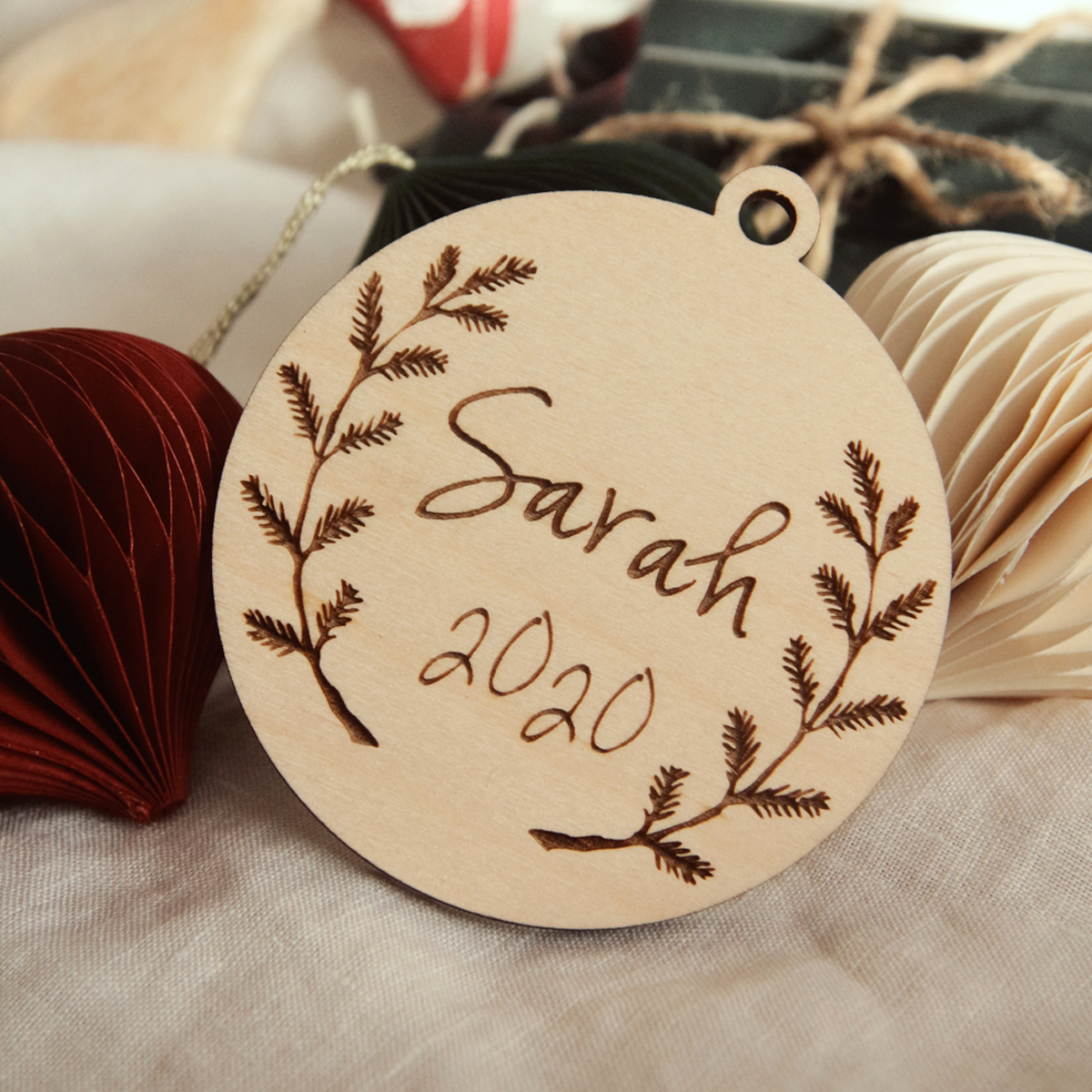Vianočná ozdoba vyrezaná z preglejky hrúbky 4mm s gravírovaným vianočným motívom, menom alebo menom aj s rokom. Povrch je prírodný, prebrúsený do hladka.