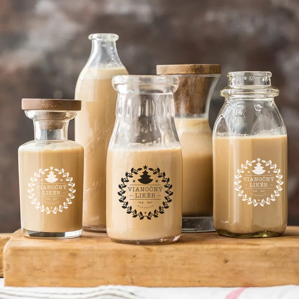 Vianočné samolepiace etikety na domáci vianočný likér tlačené bielou/čiernou UV tlačou na kvalitnú priehľadnú fóliu. Nálepky sú vodeodolné.